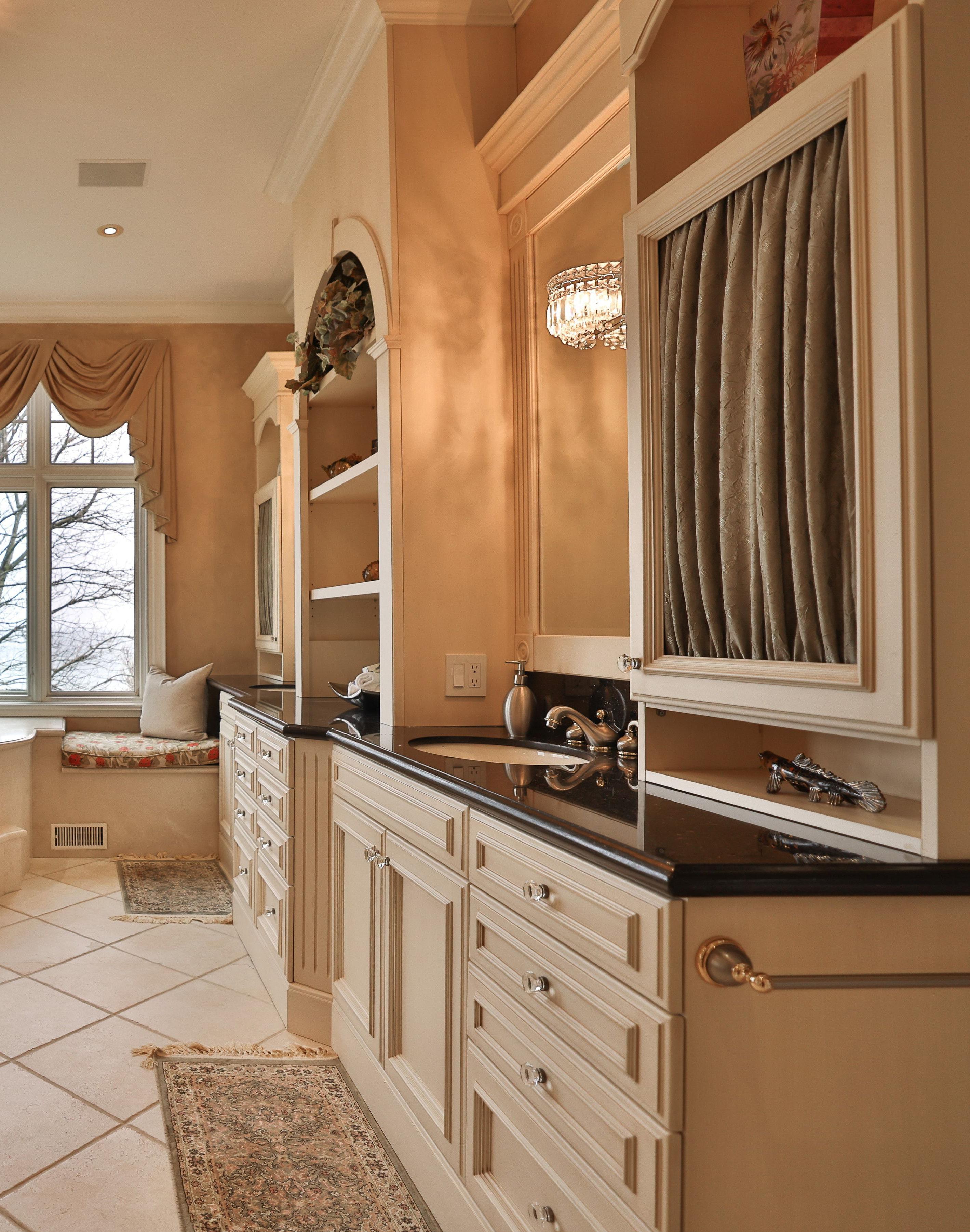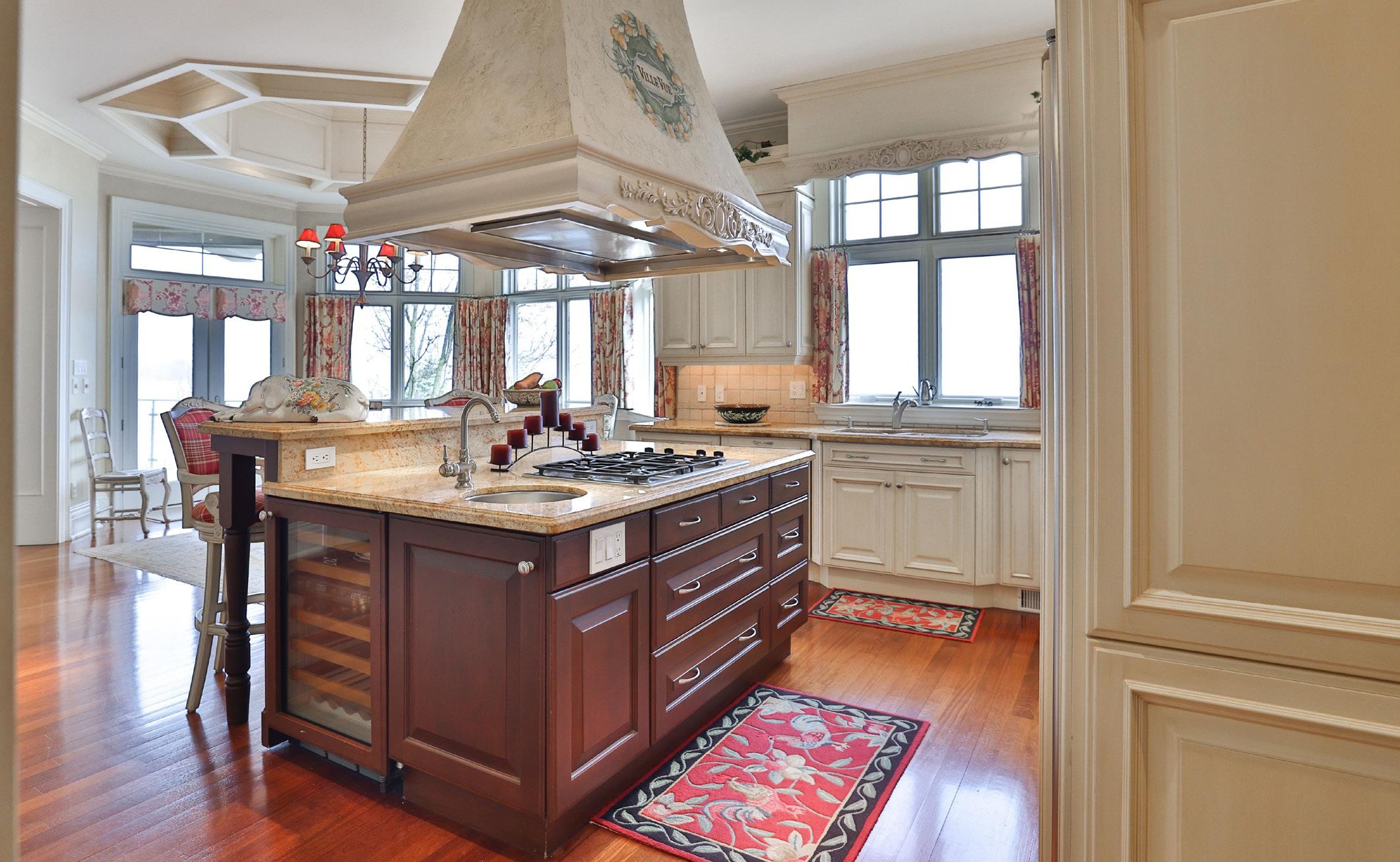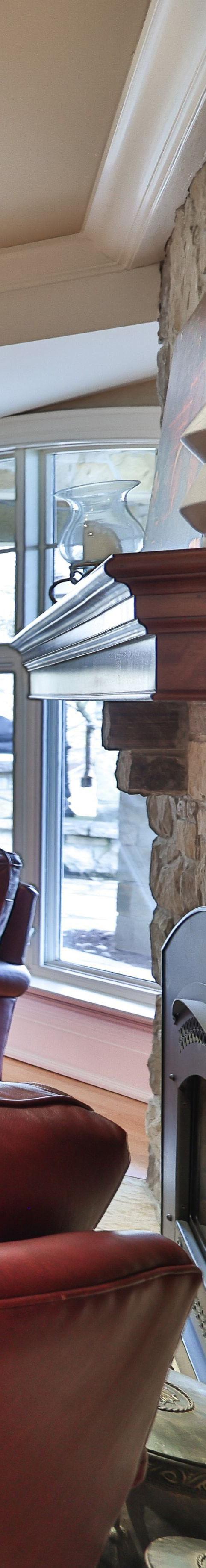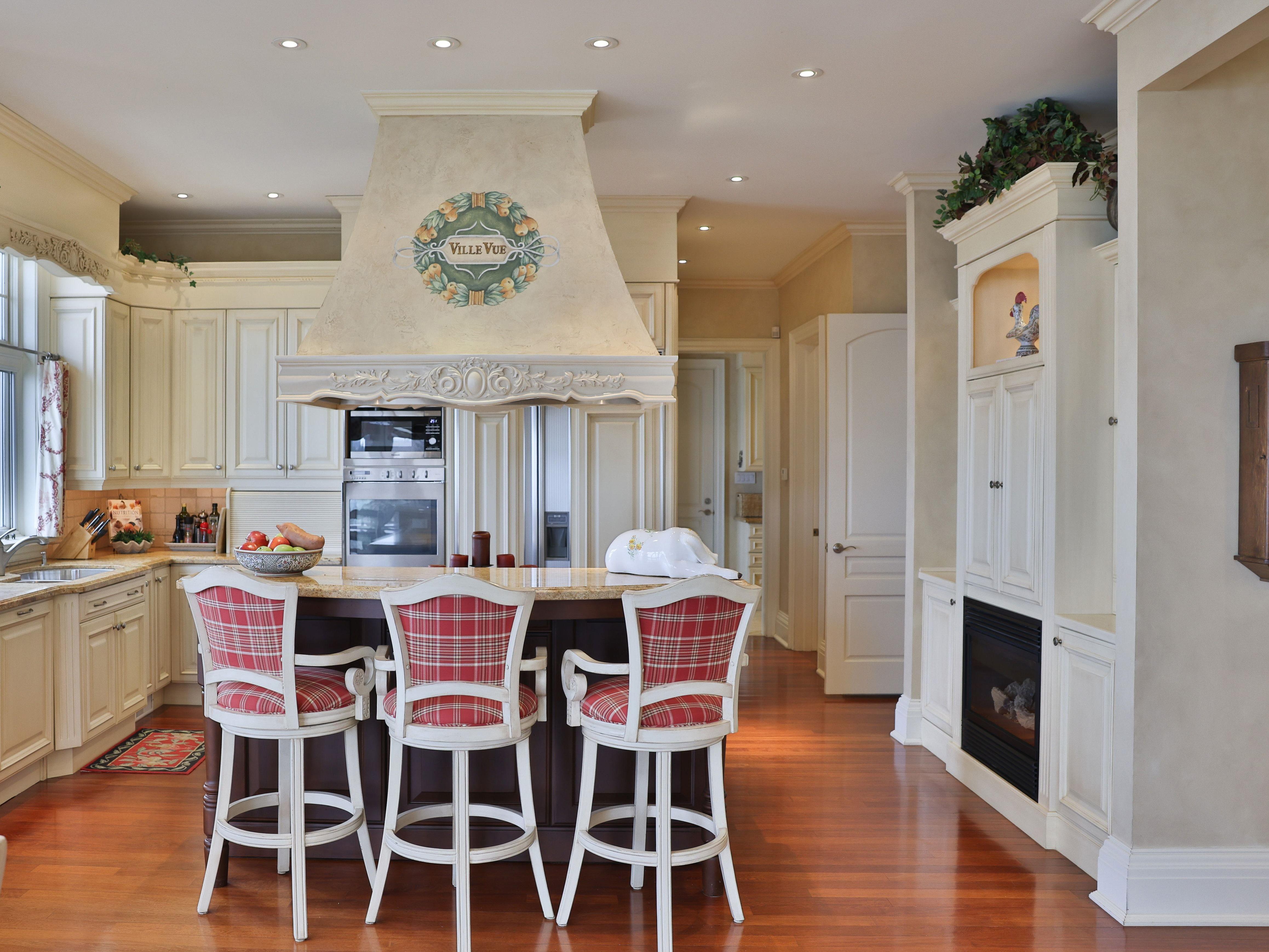 At the heart of the main level, the French country-inspired chef’s kitchen blends timeless charm with exceptional performance. Thoughtfully designed to bring people together, the space features a warm and welcoming eat-in area suited to quiet mornings and lively gatherings alike. The appliance package is among the finest available: a panelled SubZero refrigerator and freezer, Thermador fourburner gas cooktop, St. George double wall ovens, Dacor warming drawer, SubZero wine fridge, Miele dishwasher, Panasonic microwave, and a dedicated hood fan. The kitchen flows naturally into the sunlit great room and formal dining area, and a direct walkout to the terrace extends the entertaining experience outdoors against sweeping views of Lake Ontario.