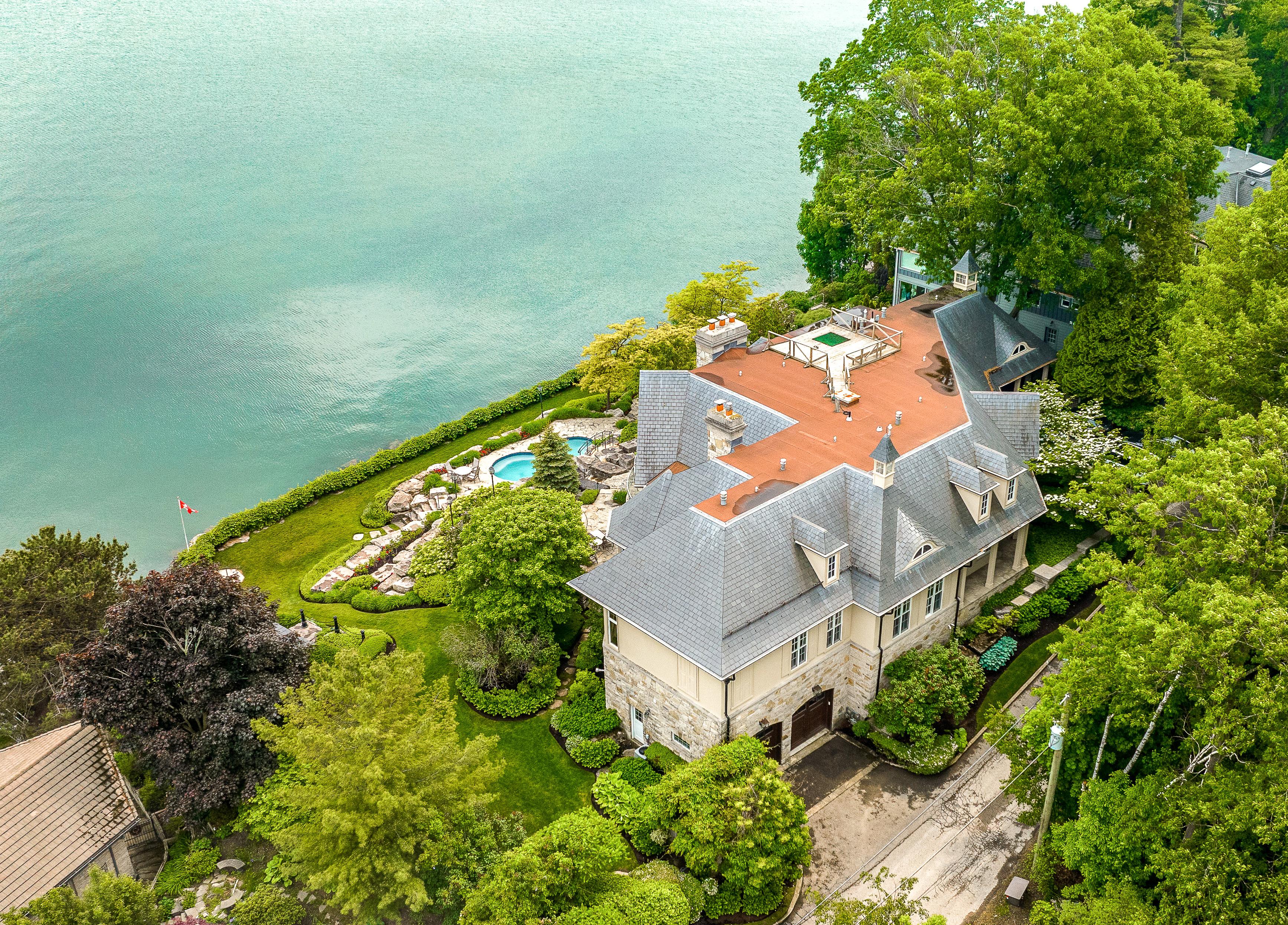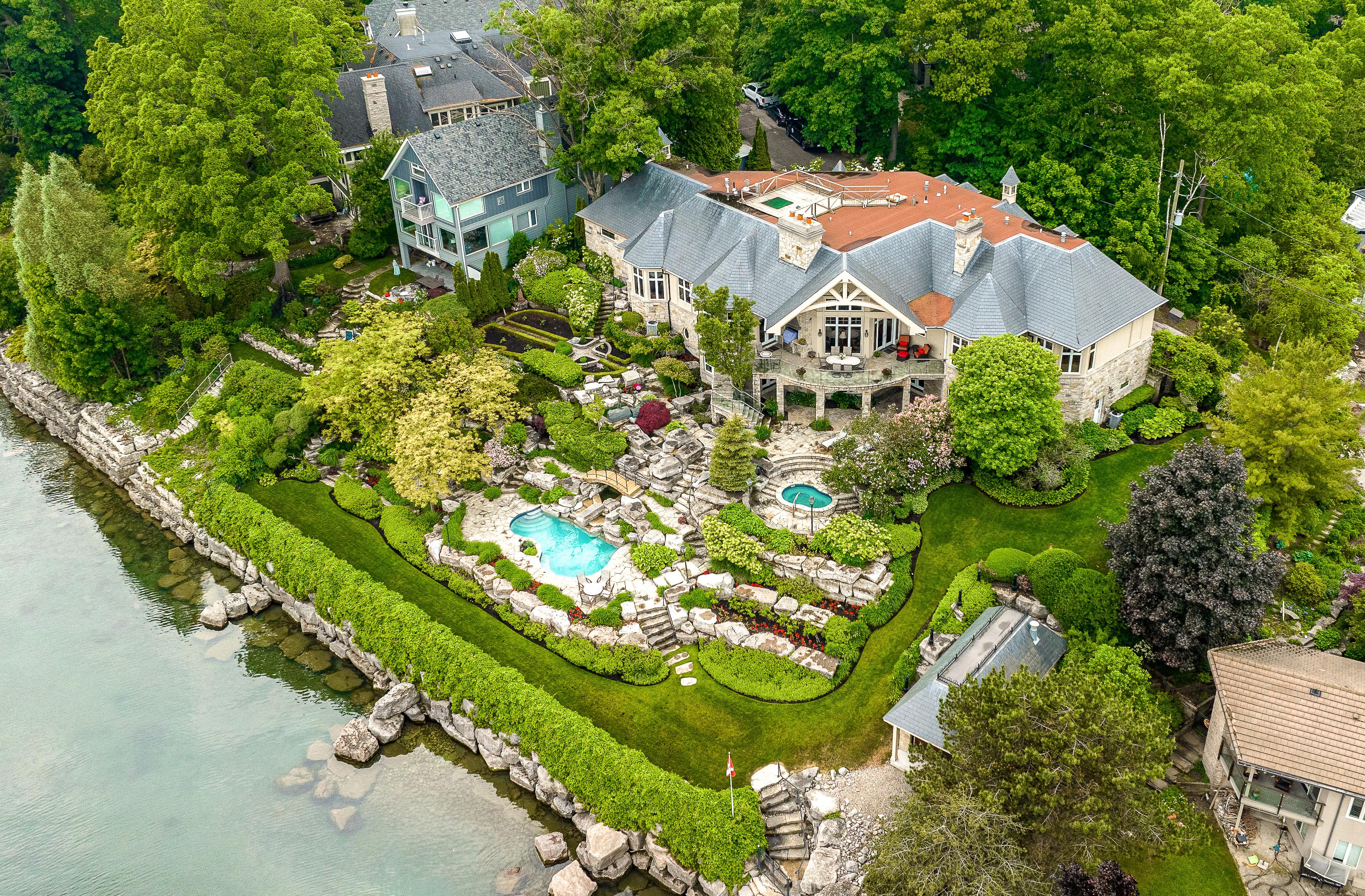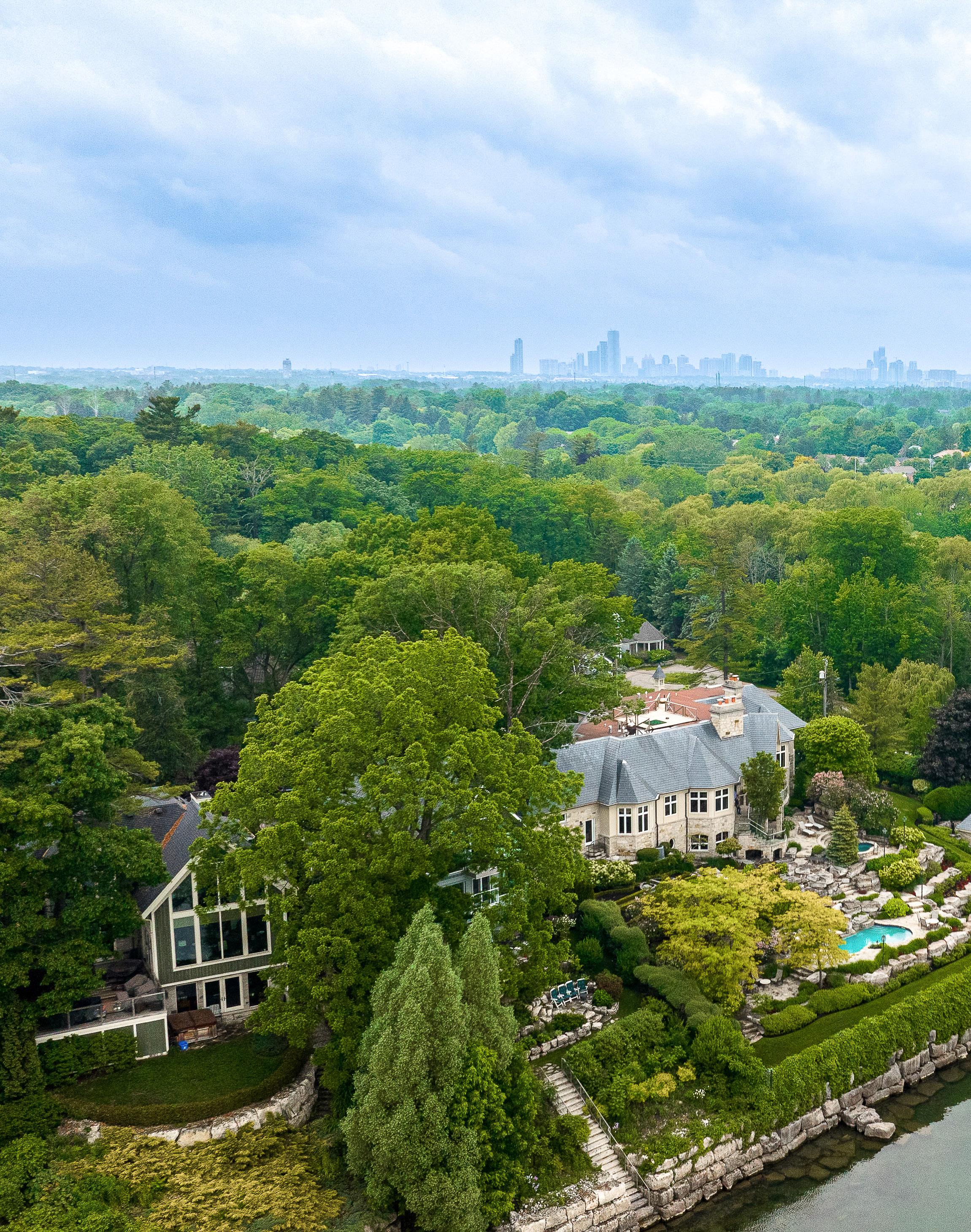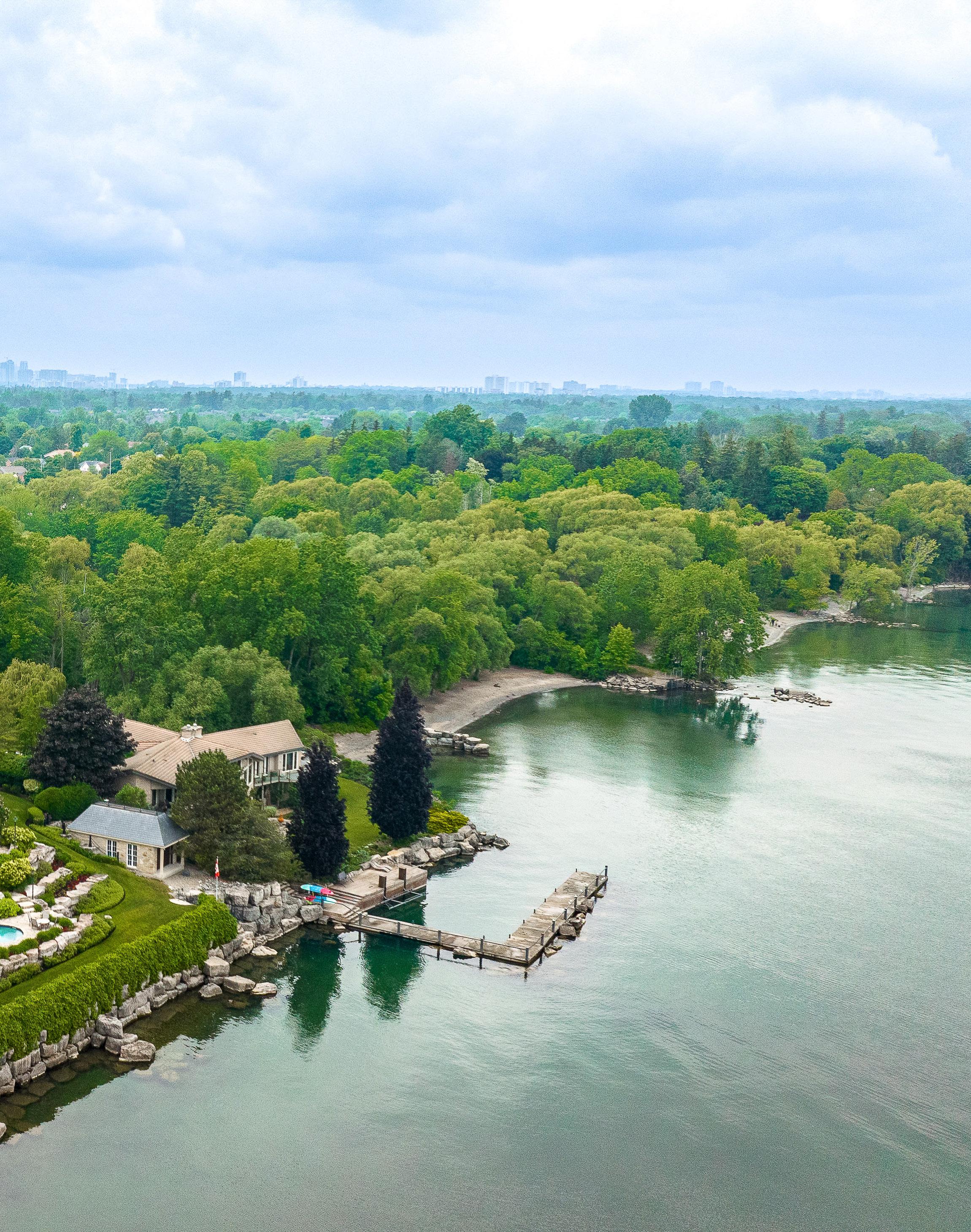 Anchored on over half an acre of coveted riparian shoreline along Lake Ontario, Villa Vue Estate is a residence of extraordinary scale, setting, and presence. With approximately 173 feet of prized water frontage and unobstructed sightlines to the Toronto skyline and CN Tower, this is a property that defines what lakefront living in Mississauga can truly be. Set along a quiet, tree-lined street in the prestigious enclave of Lorne Park — a community known for its estate properties, mature canopy, and proximity to the water — the location alone commands attention.