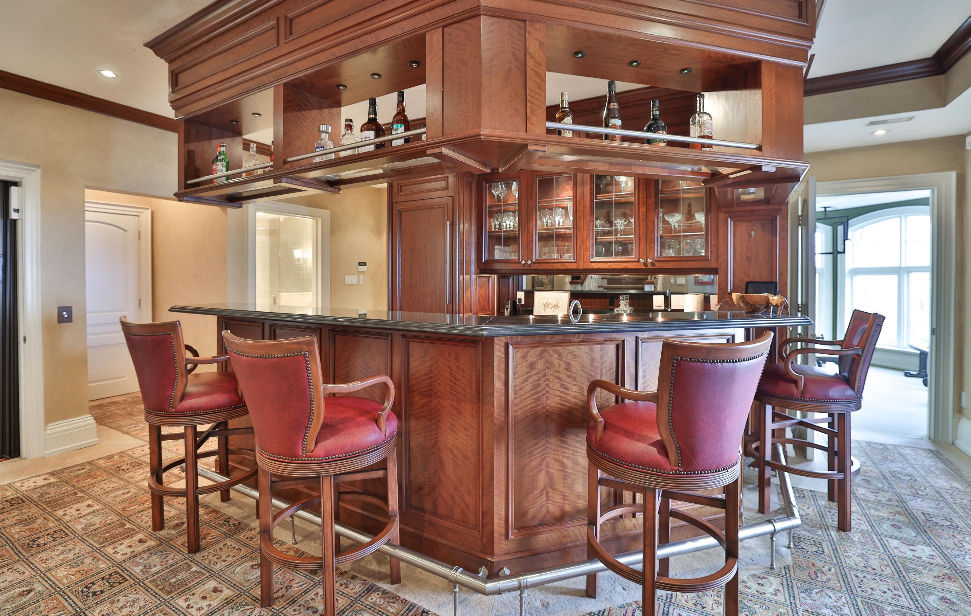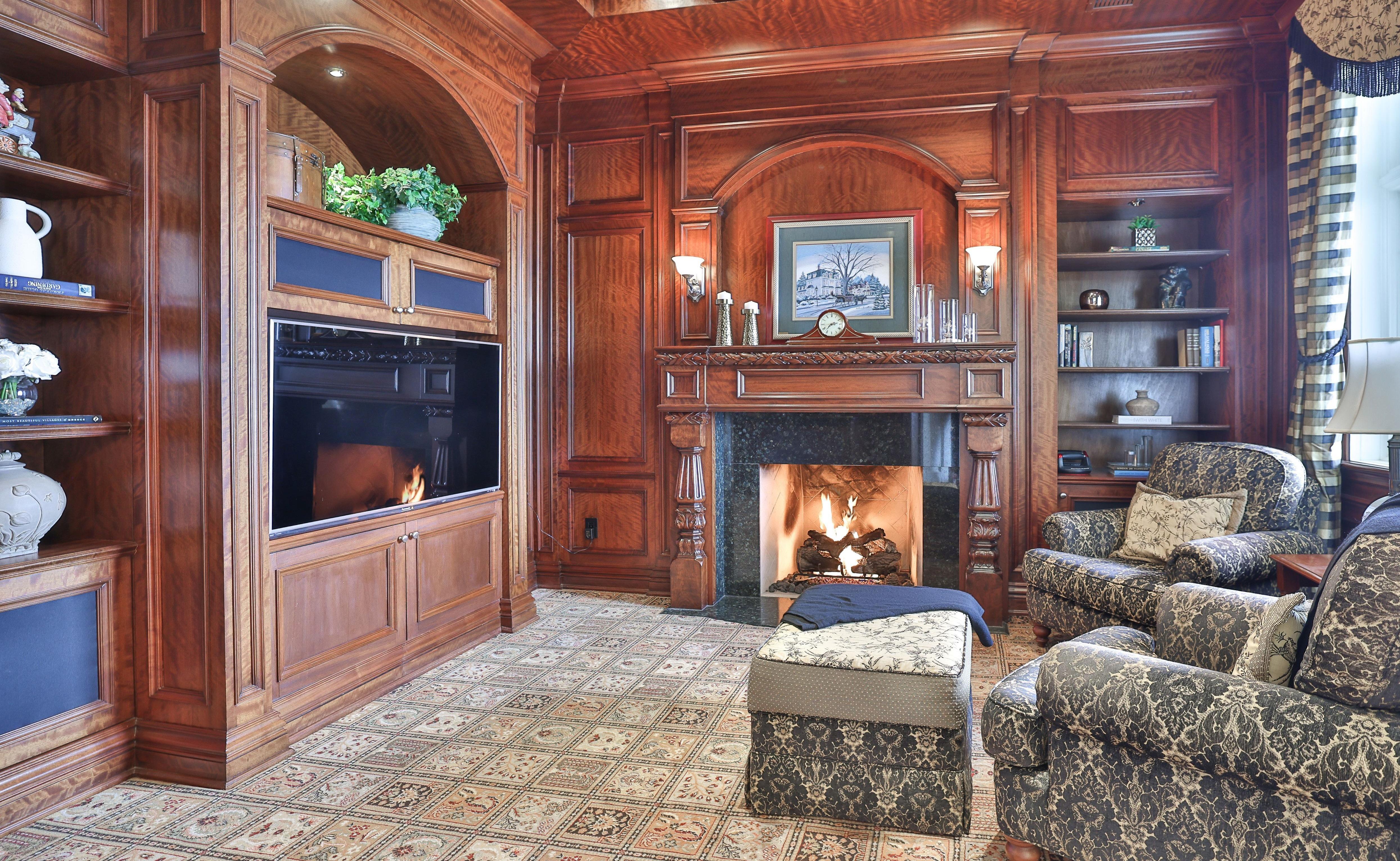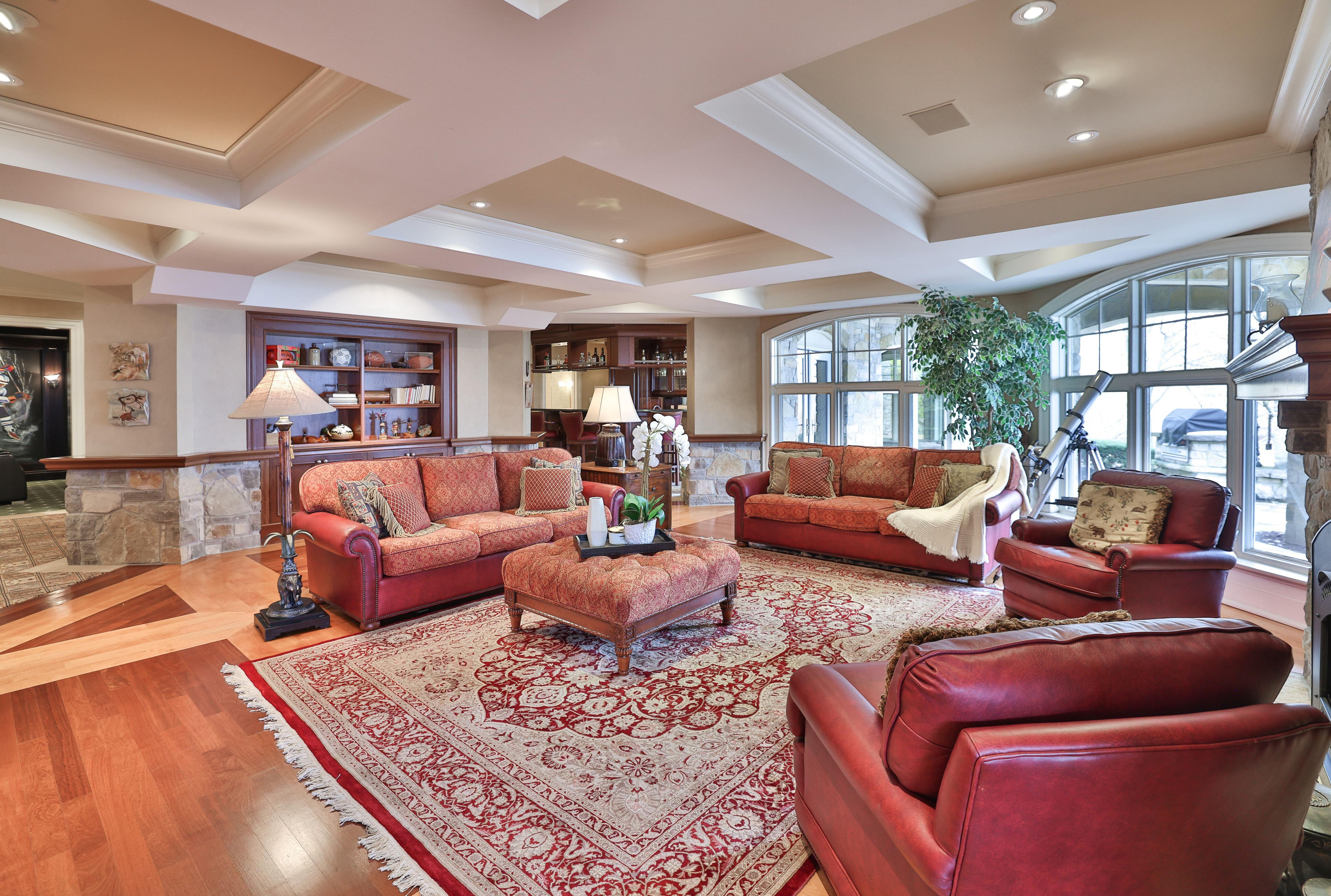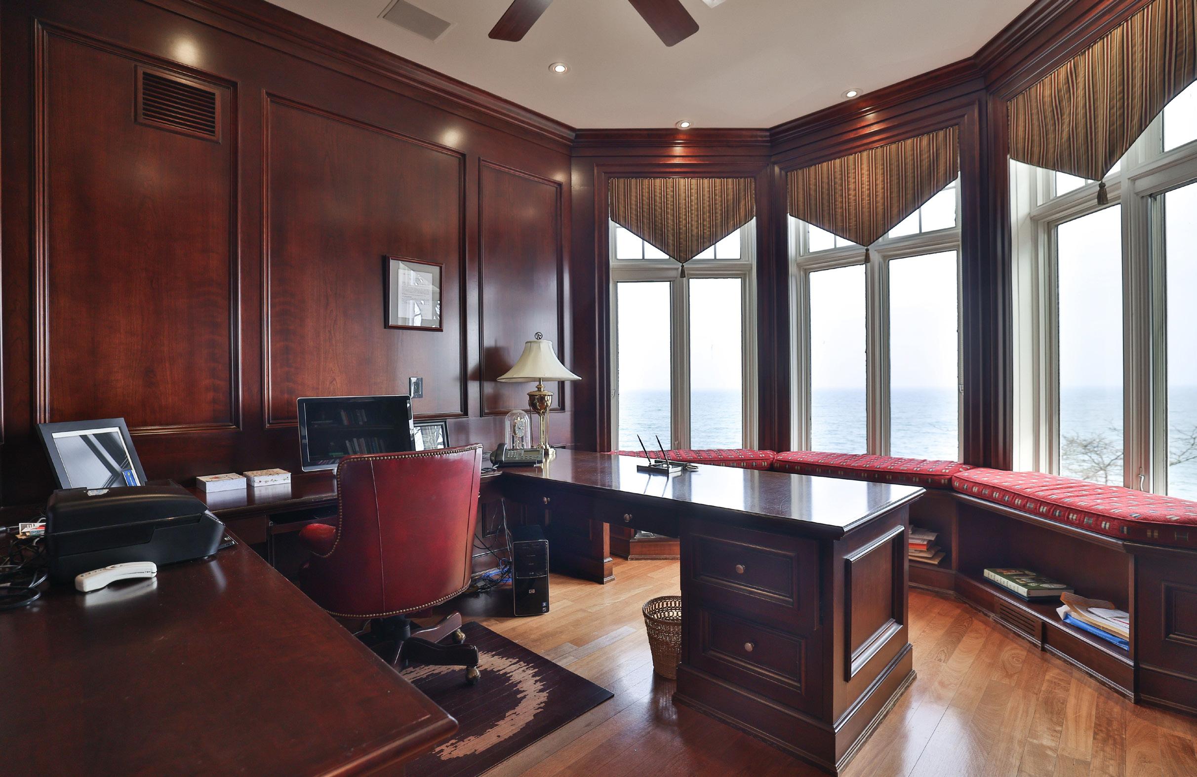 The formal dining room provides an elegant setting for entertaining, comfortably seating ten and suited equally to intimate dinners and larger, more celebratory occasions. For more relaxed moments, the den retreat is richly finished in African mahogany and complete with a gas fireplace and wet bar — a space that is both sophisticated and inviting, with its own discreetly positioned powder room. A dedicated home office with custom built-in desk overlooks the water, offering commanding and inspiring lake views, and is supported by its own nearby powder room for added convenience.