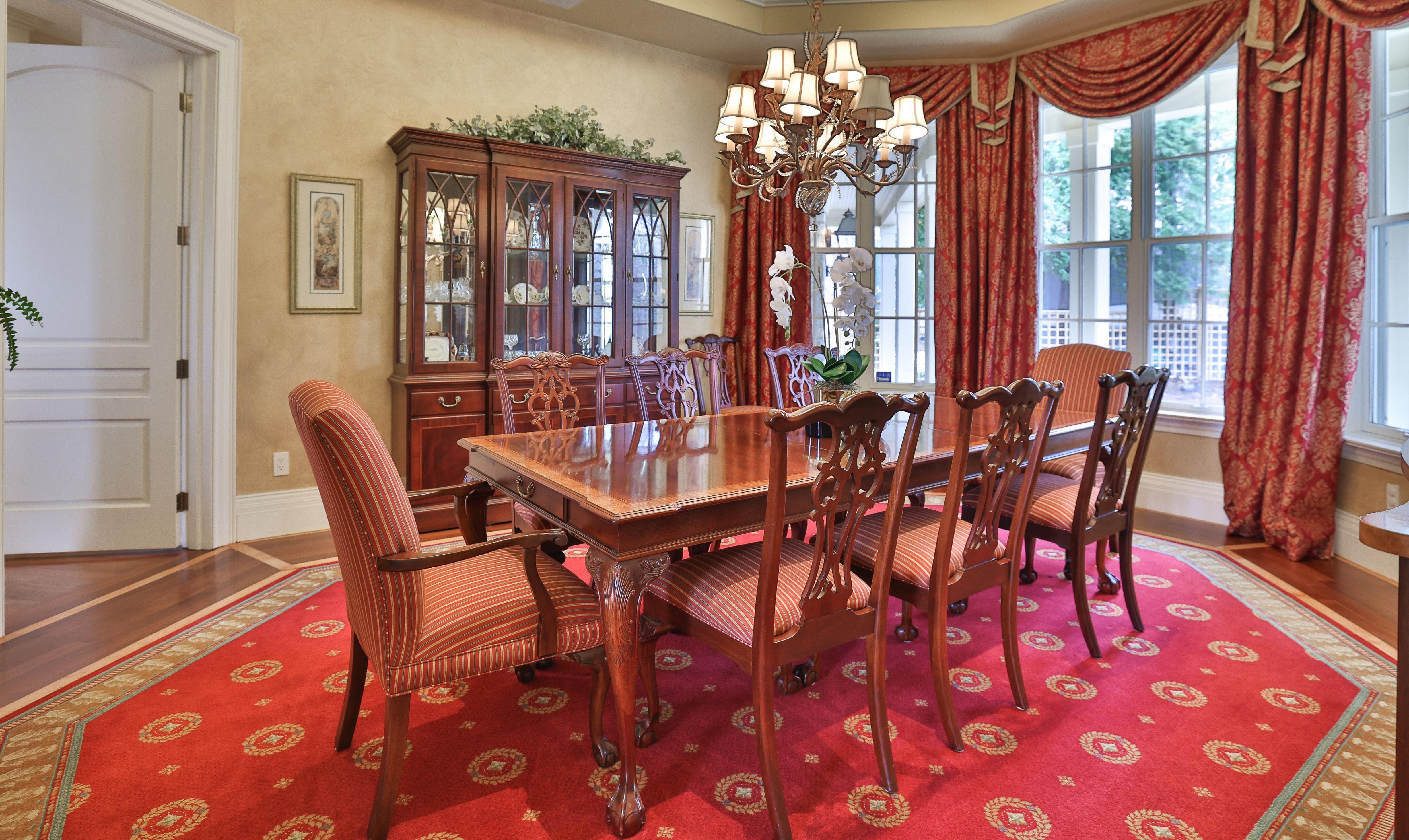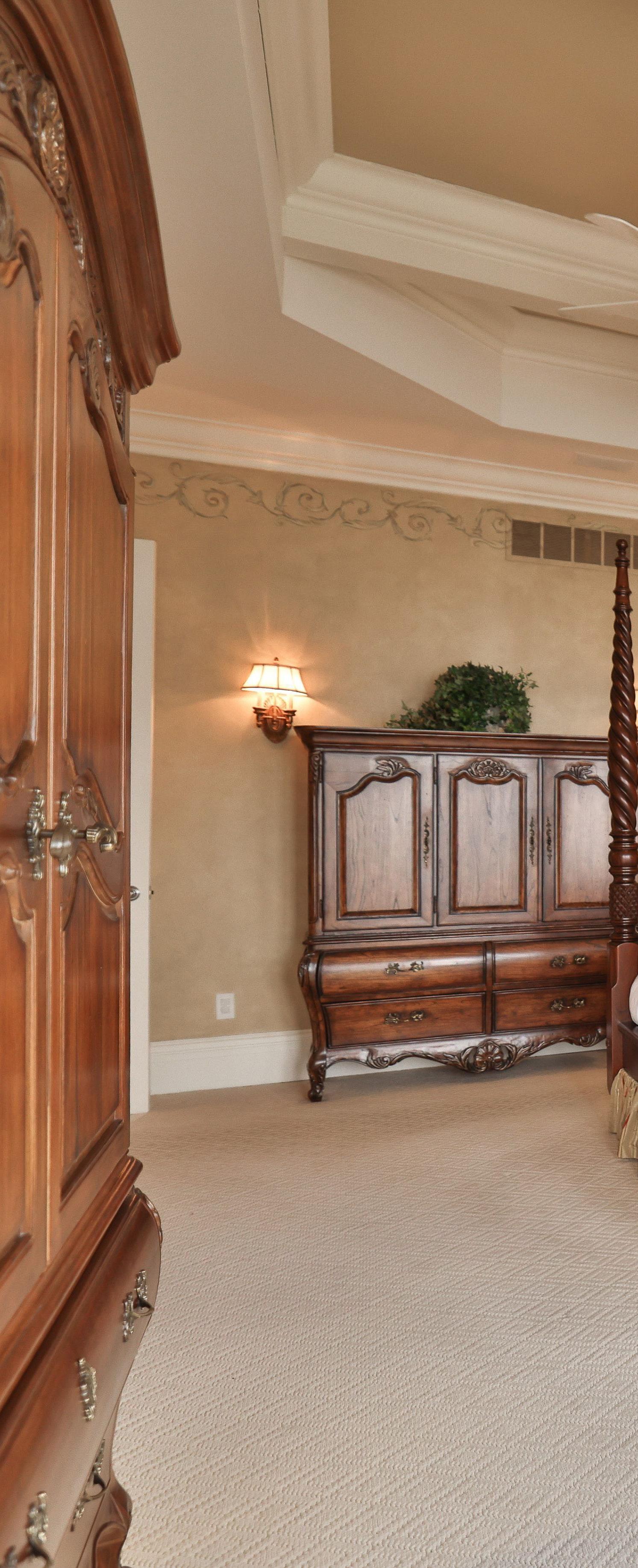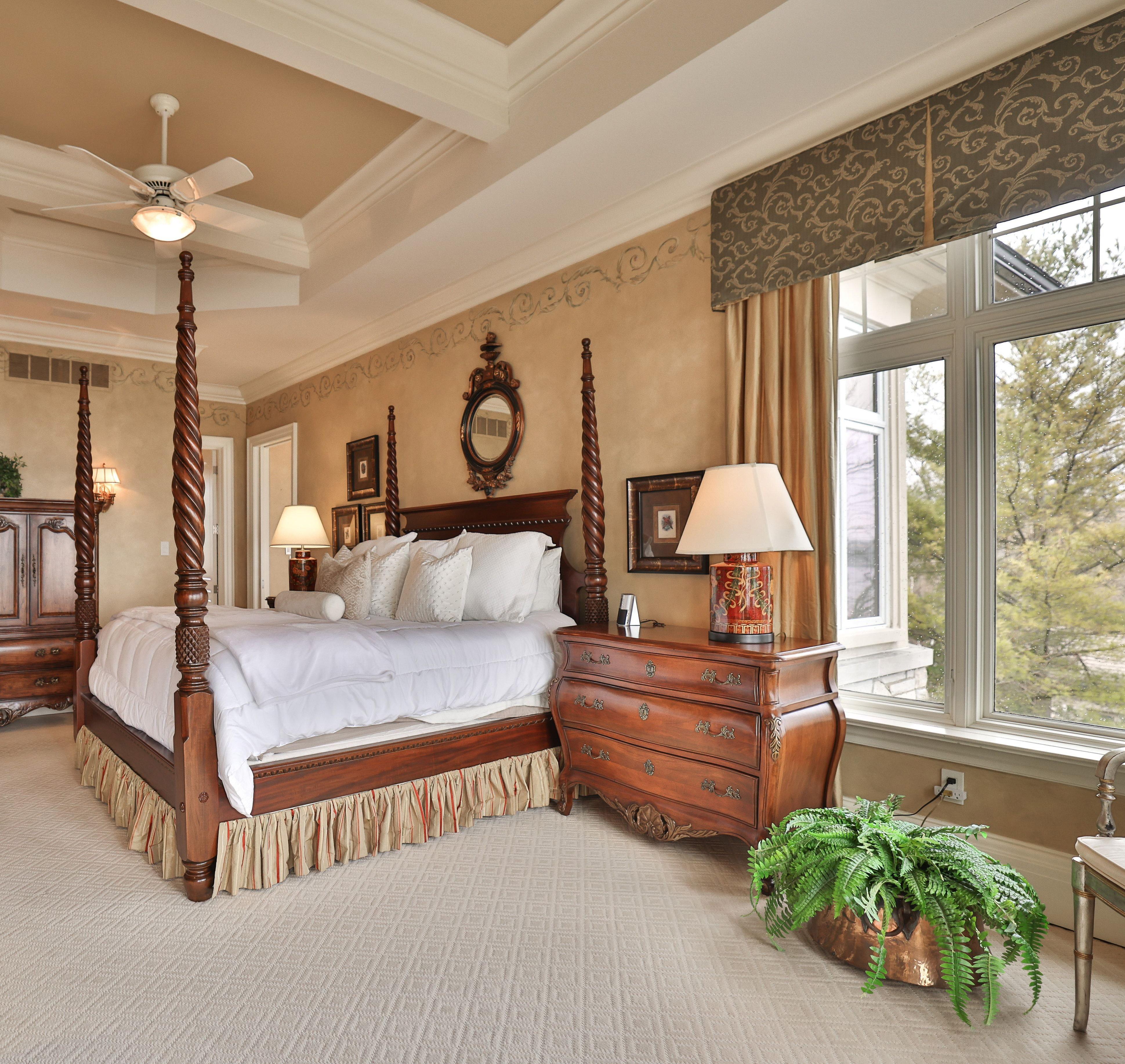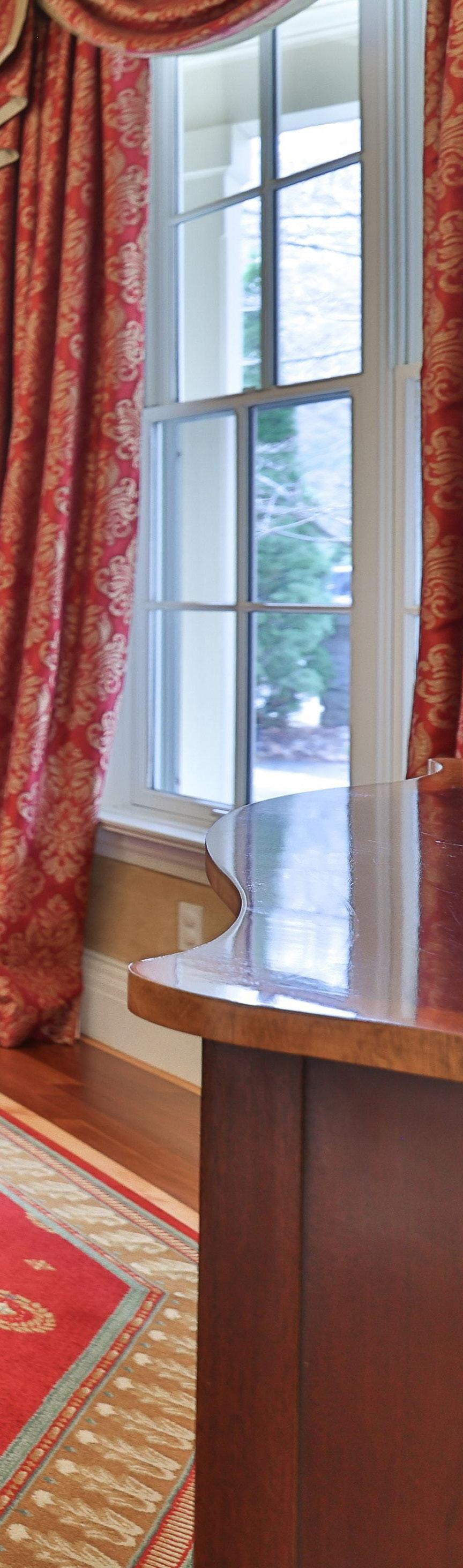 The formal dining room provides an elegant setting for entertaining, comfortably seating ten and suited equally to intimate dinners and larger, more celebratory occasions. For more relaxed moments, the den retreat is richly finished in African mahogany and complete with a gas fireplace and wet bar — a space that is both sophisticated and inviting, with its own discreetly positioned powder room. A dedicated home office with custom built-in desk overlooks the water, offering commanding and inspiring lake views, and is supported by its own nearby powder room for added convenience.
