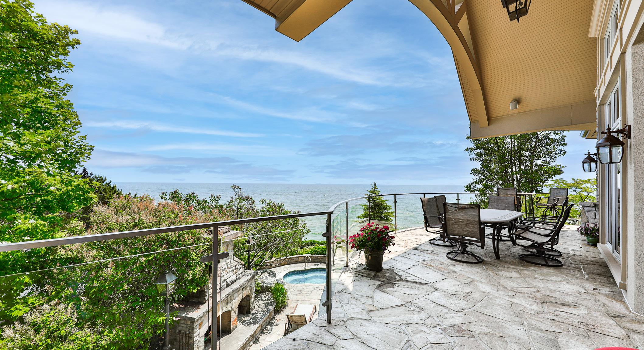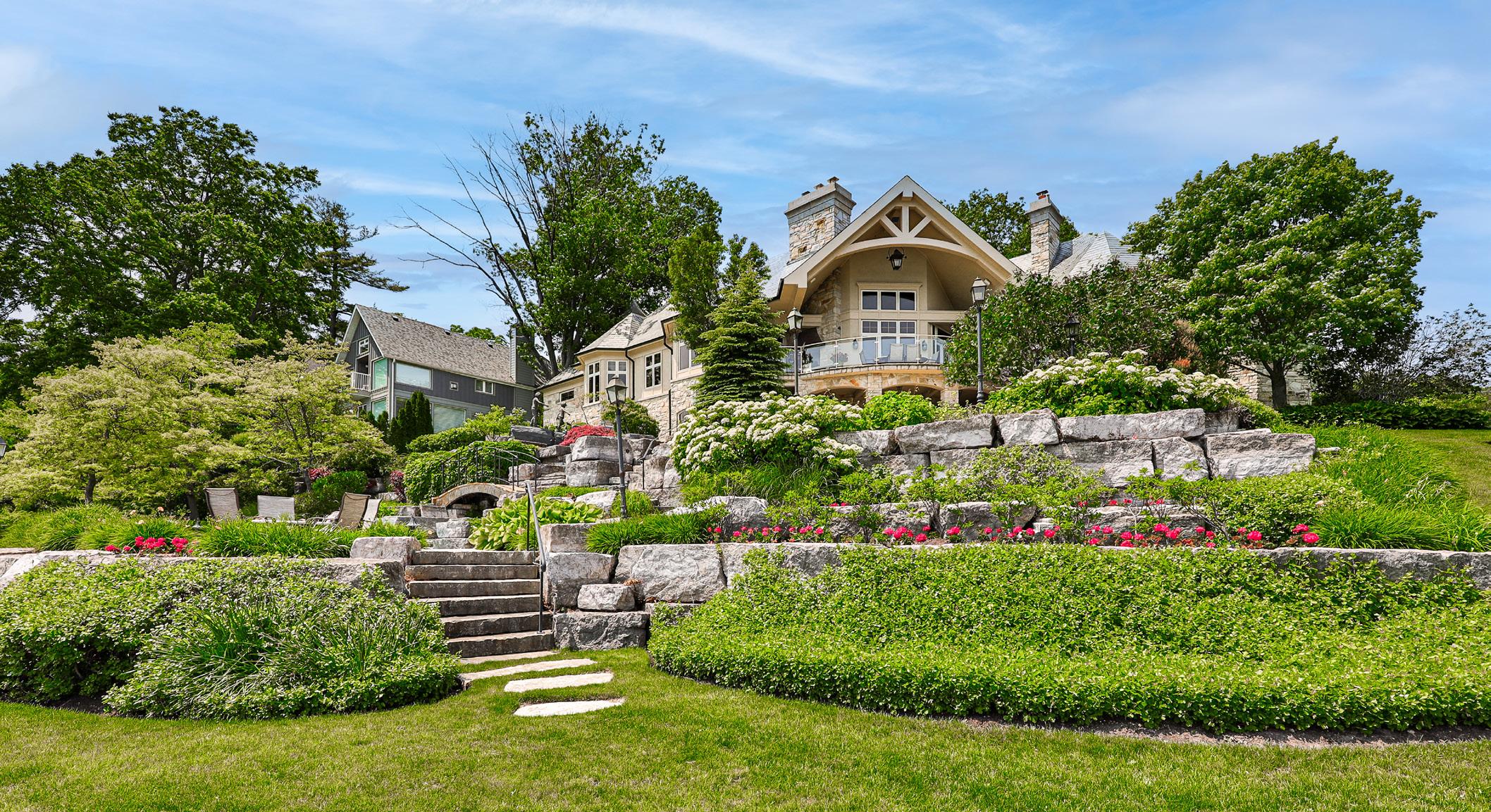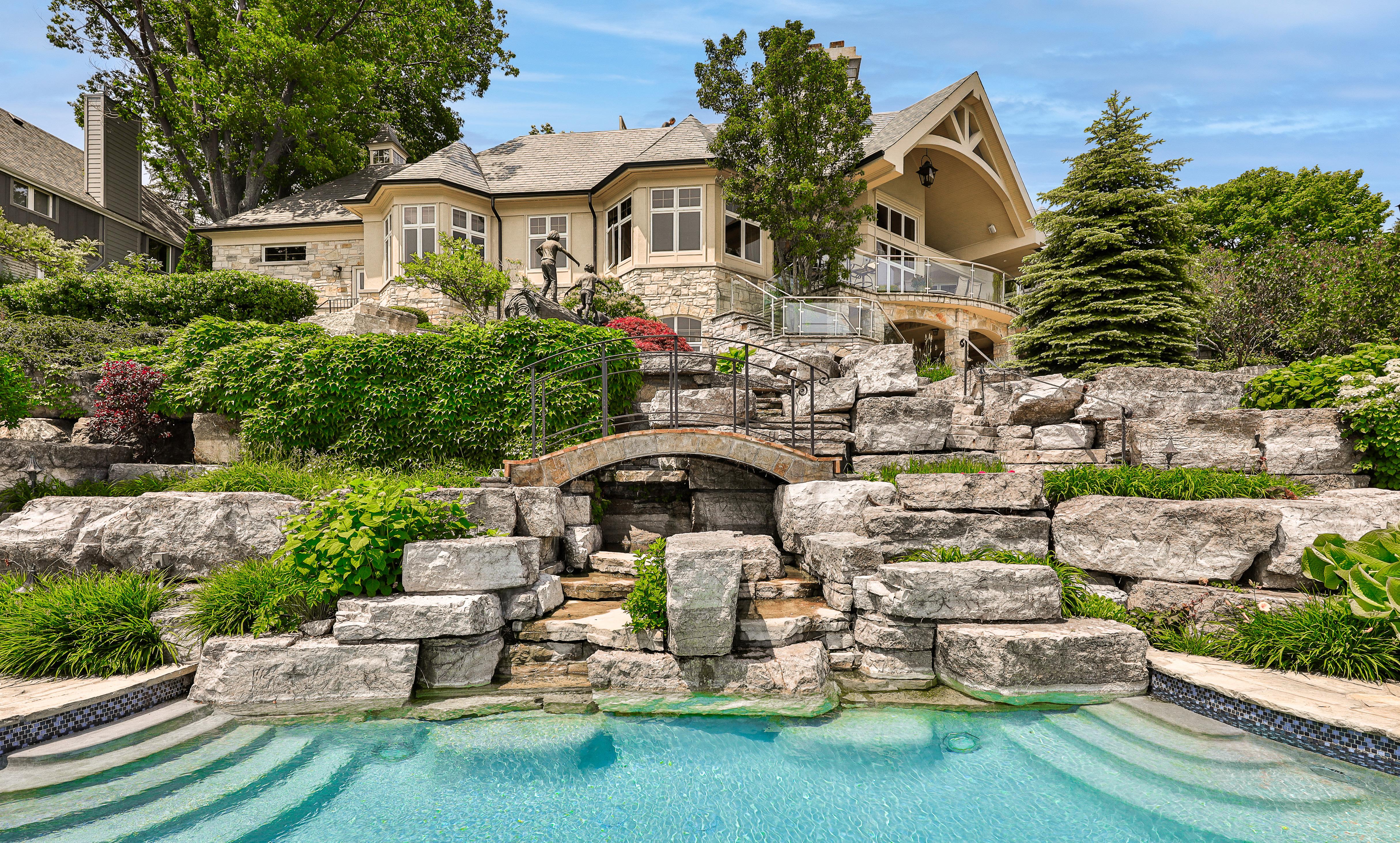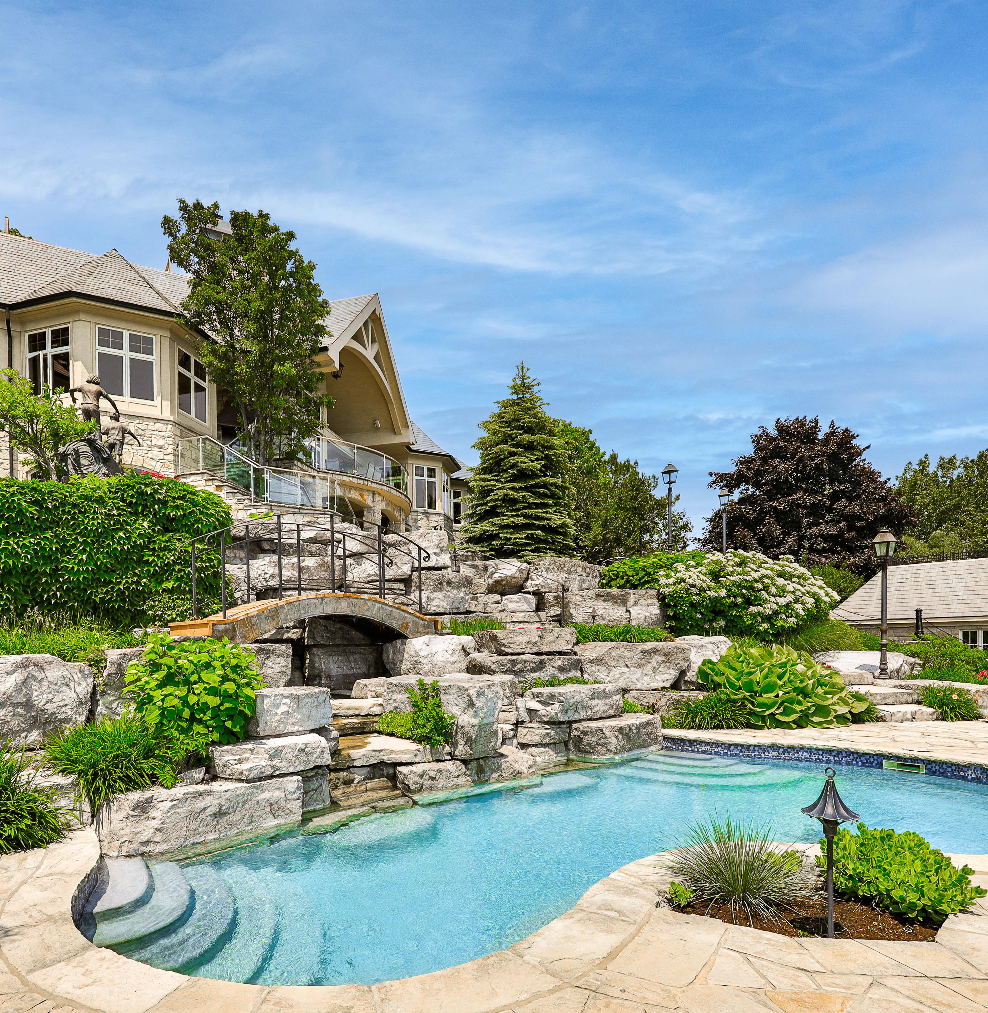 Outdoors, the estate fully reveals the depth and ambition of its design. Cascading limestone terraces step gracefully down toward the shoreline, creating a series of distinct yet connected outdoor rooms — each offering its own vantage point for dining, lounging, or gathering around the warmth of twin stone fireplaces. The grounds evoke the feeling of a private resort, with a pool, hot tub, and two built-in Crown Verity BBQs positioned to make the most of the lakeside setting.