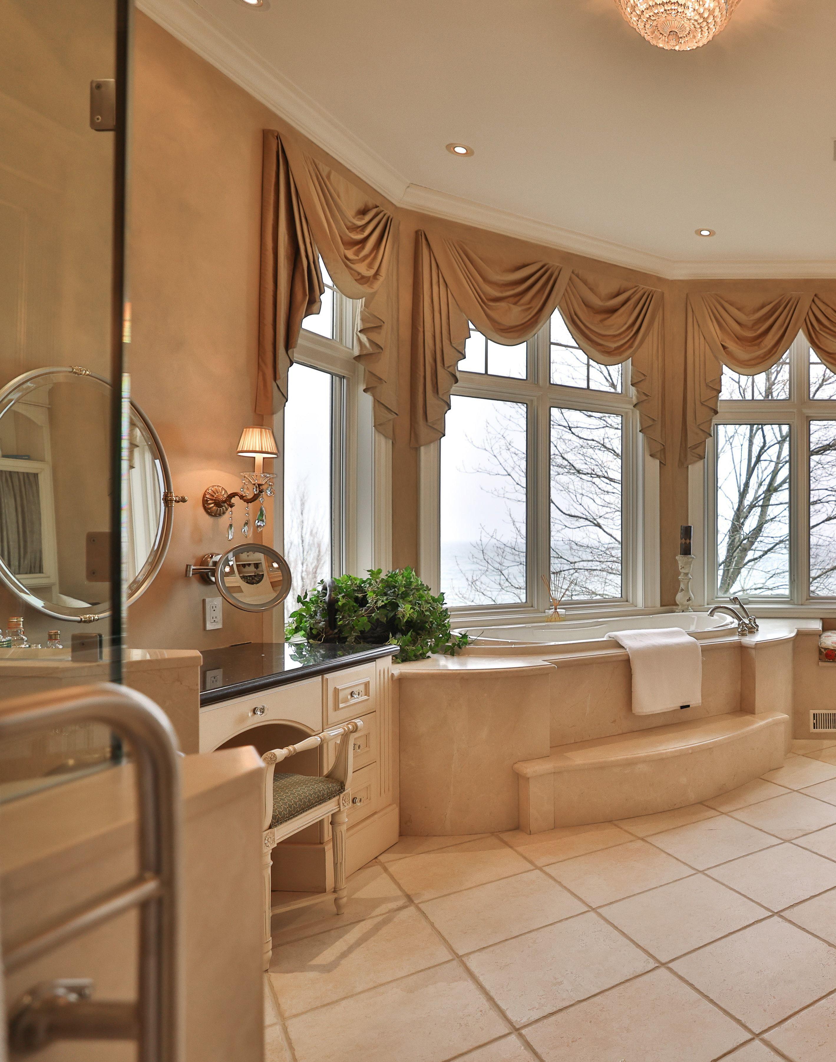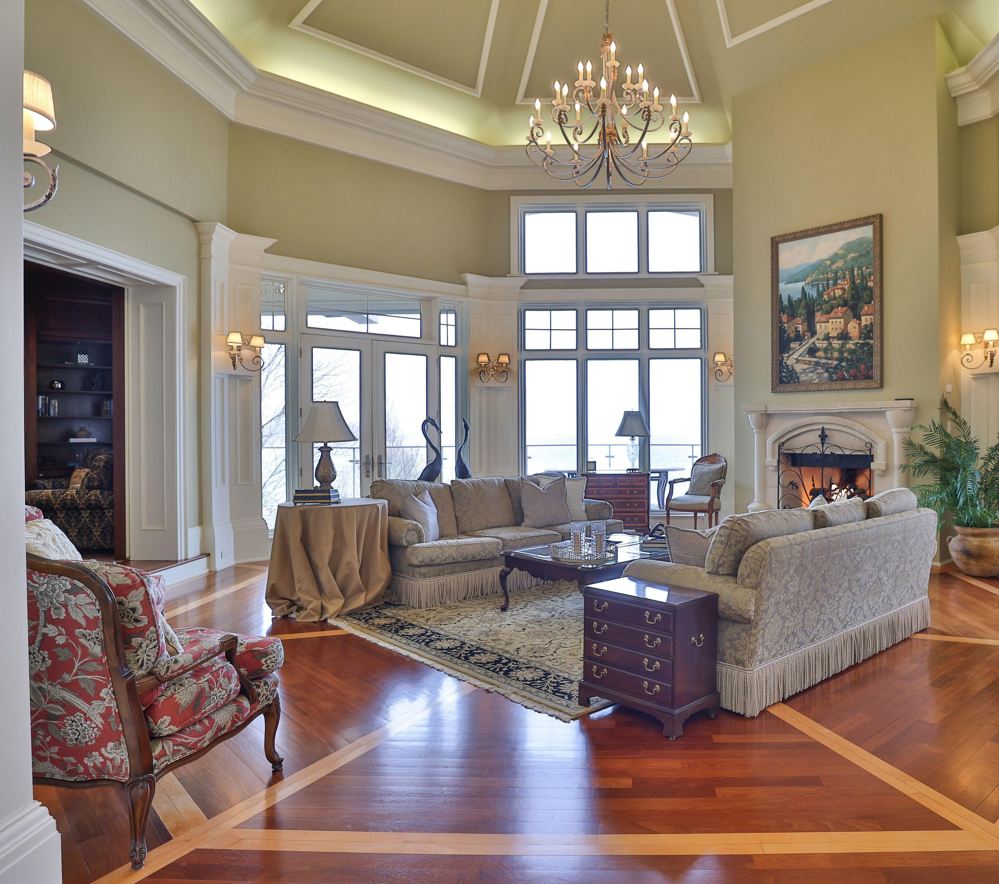 The main level is anchored by a dramatic sunken great room where vaulted ceilings create an immediate sense of volume and grandeur. A gas fireplace adds warmth and ambiance, while expansive windows frame uninterrupted views of Lake Ontario. A walkout to the terrace extends the living experience outdoors effortlessly, connecting interior and landscape in seamless fashion.
