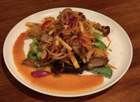 the chicken satay, a perfectly juicy skewered chicken that my sister will devour after a hard practice. The chive dumplings and imperial puffs are favorites of locals, and if you’re looking for vegetarian options, you can’t go wrong with their crispy fried tofu served with sweet chili sauce. To warm the soul on more frigid days, we like to get tom kha, a spicy soup with coconut cream and chicken, or tom yum, its non - spicy, more sour, lemongrass counterpart, served with shrimp. For a refreshing starter, the flavorful papaya salad always hits the spot.