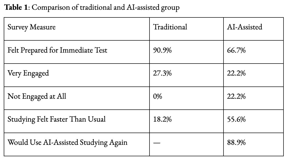 The findings reinforce prior research suggesting that, although efficient, digital tools may reduce active cognitive engagement during learning tasks. Students in the Traditional Study Group scored 11.82 percentage points higher overall and appeared to have exerted greater mental effort by actively organizing, summarizing, and rehearsing information, which enhanced memory consolidation. Conversely, the AI-Assisted Group transferred much of this mental workload to the software, reducing opportunities for cognitive elaboration. These outcomes align closely with the MIT Media Lab study, which observed lower neural activation among participants who were dependent on ChatGPT. The results also reveal a discrepancy between perceived and actual learning. Many AI users expressed confidence in their understanding and reported that they would use AI to study again. However, their test scores indicated otherwise, reaffirming the cognitive illusion theory, which holds that externally simplified information can produce a false sense of mastery. While this study indicates stronger short-term retention among students using traditional learning methods, it does not argue that AI lacks potential educational value. Instead, it suggests that AI tools should be integrated thoughtfully: to support, rather than replace, human effort. Blended approaches, in which AI provides feedback or clarification while students retain control over processing and note-taking, may mitigate cognitive offloading. In the future, research should explore such hybrid strategies and examine longterm retention, creativity, and analytical reasoning across diverse student populations. We recognize that the size of this study is small; therefore, we hope to repeat it similarly with a larger number of students to draw stronger conclusions.