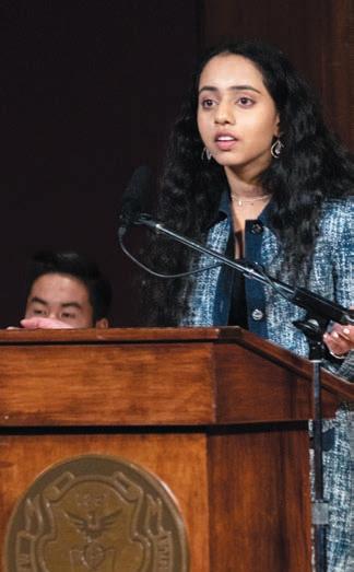 Sriya Tallapragada ’25 won the 2023 Dr. Robert H. LeBow ’58 Memorial Oratorical Competition with her speech “It’s Time to Be Real—Really,” which was inspired by BeReal, an app that notifies people to share selfies of their “real life” at a different time every day, ideally within two minutes of receiving the notification. In her speech, Sriya noted that she, like many users, often posts after the two-minute window because she deems many moments of her life “too embarrassing to share.” This led to her broader observation that, in general, people want to show their best selves and hide their flaws. “Rejection, failure, and flaws may be uncomfortable to talk about,” she said, “but they’re inevitable, and hiding them from others will only mean more unnecessary curating in our lives.”