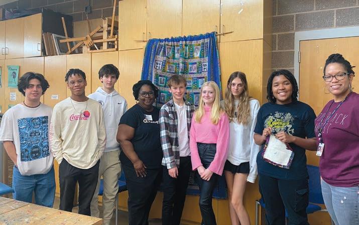 Students in Middle School visual arts classes learned how to create hand-stitched Kwandi quilts, a tradition practiced by people of East African descent who were brought to India and Pakistan during the slave trade. Quilt artist Glendora Simonson guided students through this colorful creative practice, and they sewed scrap fabric blocks that were stitched together into a large patchwork quilt.