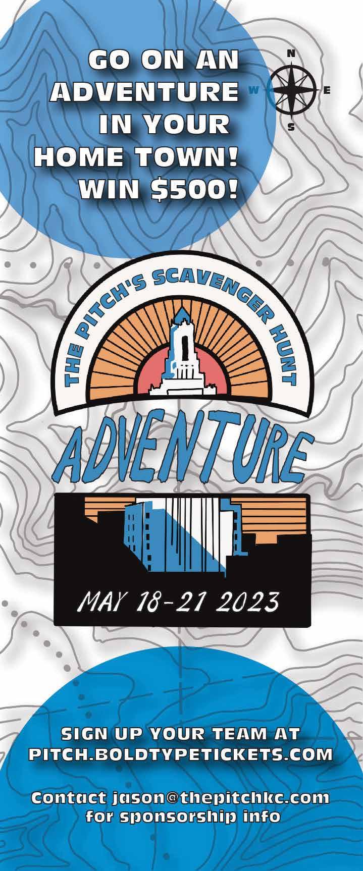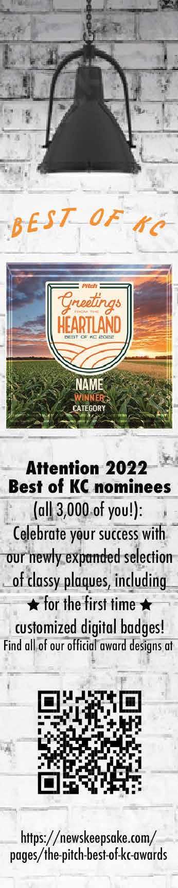 The Pitch distributes 20,000 copies a month and is available free throughout Greater Kansas City, limited to one copy per reader. Additional copies may be purchased for $5 each, payable at The Pitch’s office in advance. The Pitch may be distributed only by The Pitch’s authorized independent contractors or authorized distributors. No person may, without prior written permission of The Pitch, take more than one copy of each week’s issue. Mail subscriptions: $22.50 for six months or $45 per year, payable in advance. Application to mail at second-class postage rates is pending at Kansas City, MO 64108.