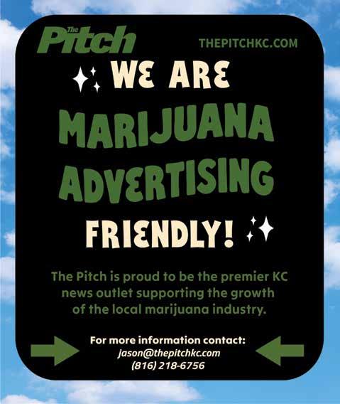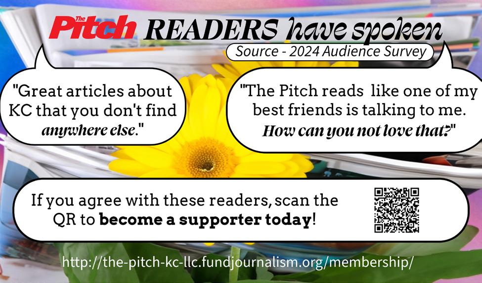 The Pitch distributes 20,000 copies a month and is available free throughout Greater Kansas City, limited to one copy per reader. Additional copies may be purchased for $5 each, payable at The Pitch’s office in advance. The Pitch may be distributed only by The Pitch’s authorized independent contractors or authorized distributors. No person may, without prior written permission of The Pitch, take more than one copy of each week’s issue. Mail subscriptions: $22.50 for six months or $45 per year, payable in advance. Application to mail at second-class postage rates is pending at Kansas City, MO 64108.