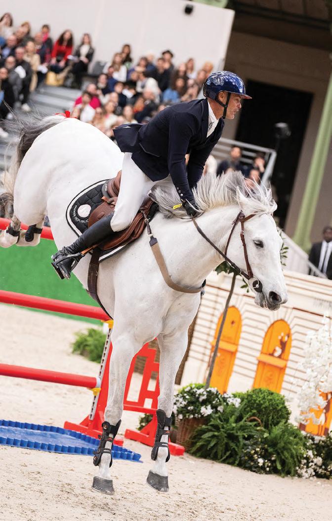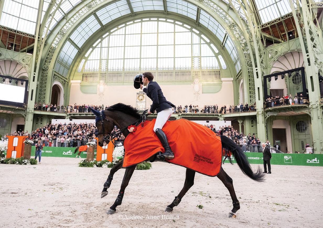 • 4 Belgium’s Gregory Wathelet riding Ace of Hearts to 6th place in the Grand Prix Hermés 2025 • 5 Simon Delestre and Cayman Jolly Jumper taking their victory gallop at Saut Hermès under the iconic glass dome of the Grand Palais Éphémère