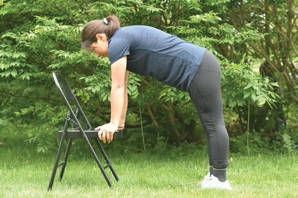 Step One: Hip hinge and place your hands flat on a solid surface like a chair (fig. A). Keep the knees slightly bent. Choose a height to lean on that feels comfortable to you.