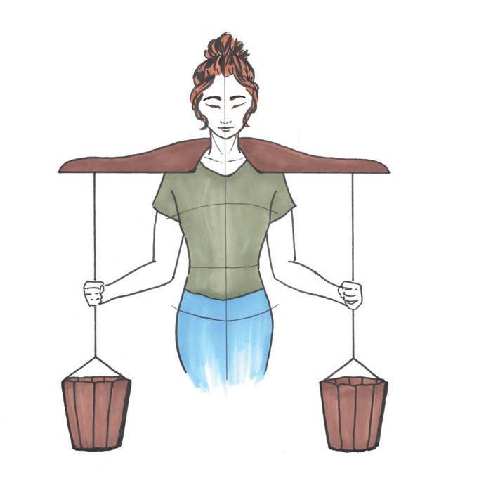 The shoulder girdle is “hung” like a yoke along the top of the thoracic area. The horizontal wooden portion of the yoke represents the collarbones. The shoulder complex is comprised of collarbones, scapulae (shoulder blades), and tops of the arm bones (humerus)