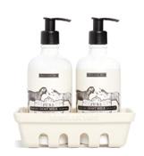 Perfect caddy set for the kitchen sink, bathroom, or guest room that gently washes and moisturizes hands. It’s for people who want to keep their hands soft, callous-free, and clean as to not offend their city friends.