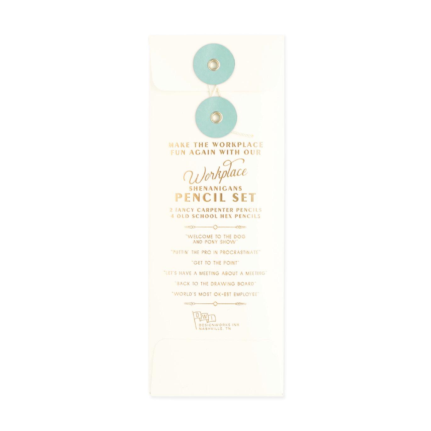 DPS-2184 WORKPLACE SHENANIGANS • Set of Six No. 2 Graphite Wood Pencils • Four Hexagon + Two Carpenter Pencils • Gold Foil-Stamped Design on Each • Gold Ferrule with White Erasers • Made in the USA • Packaged in a Giftable Button-String Closure Envelope