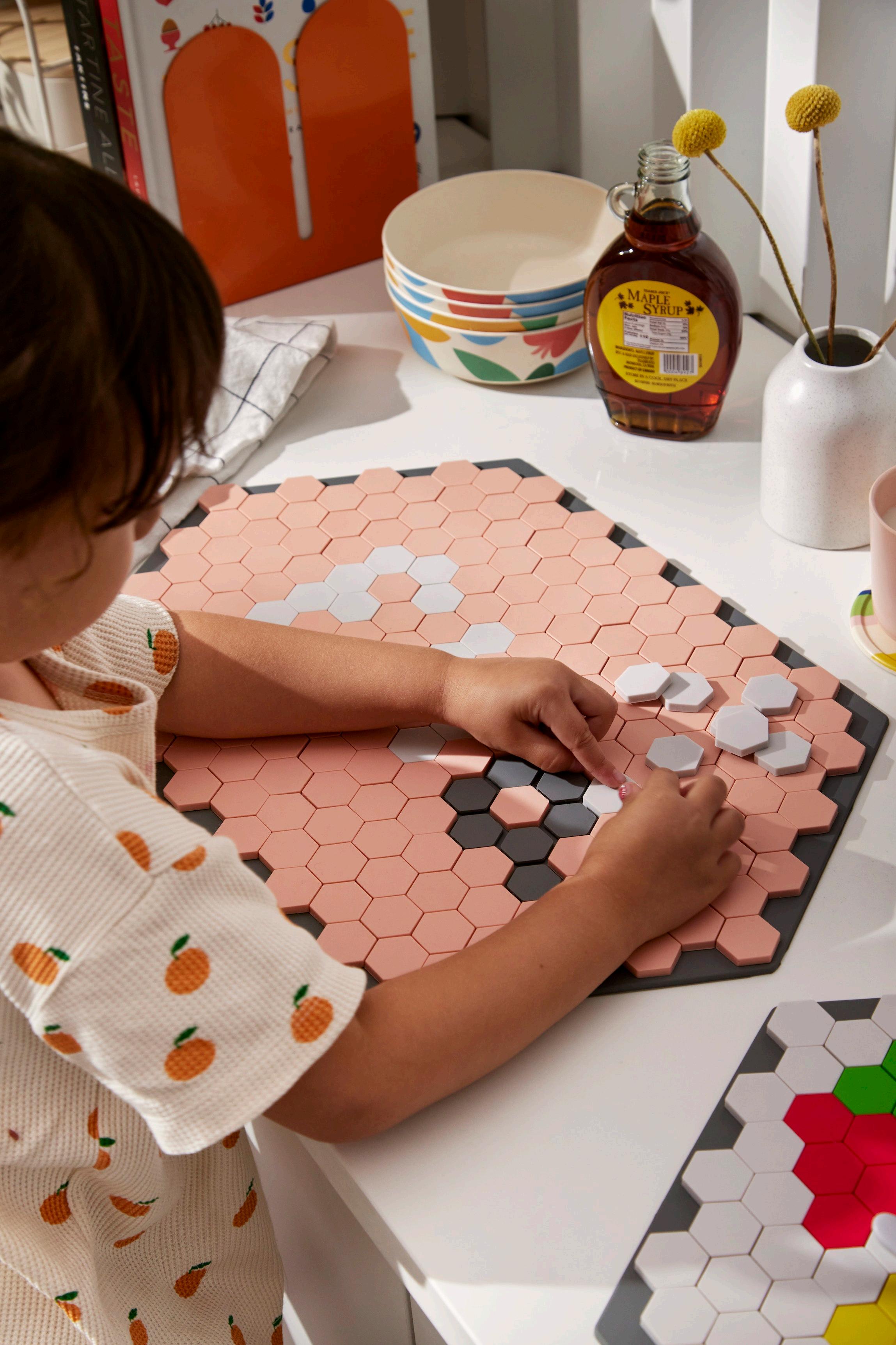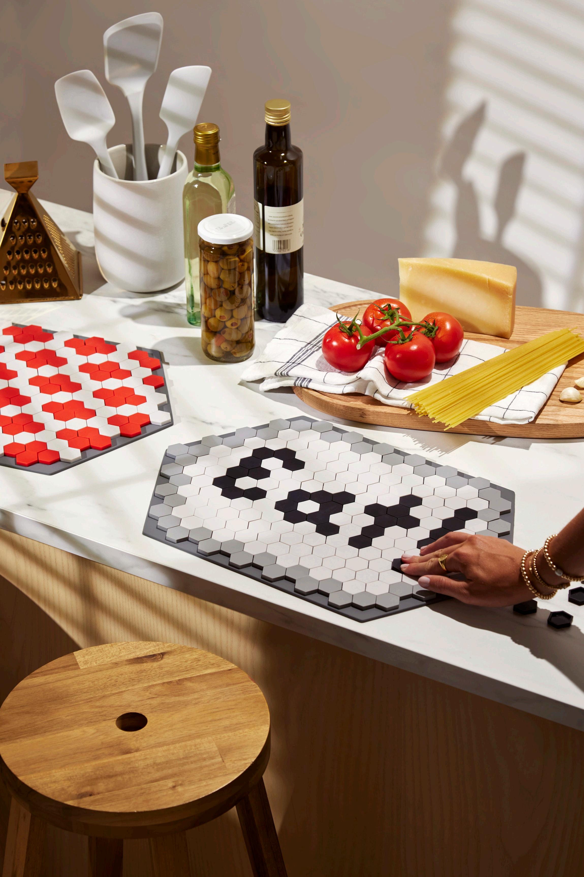Tile Mat is an all-purpose mat that’s functional, beautiful, and — most importantly — customizable. Its timeless, vintage-inspired hexagon tile design and removable caps can be used to create endless patterns, designs, and words.