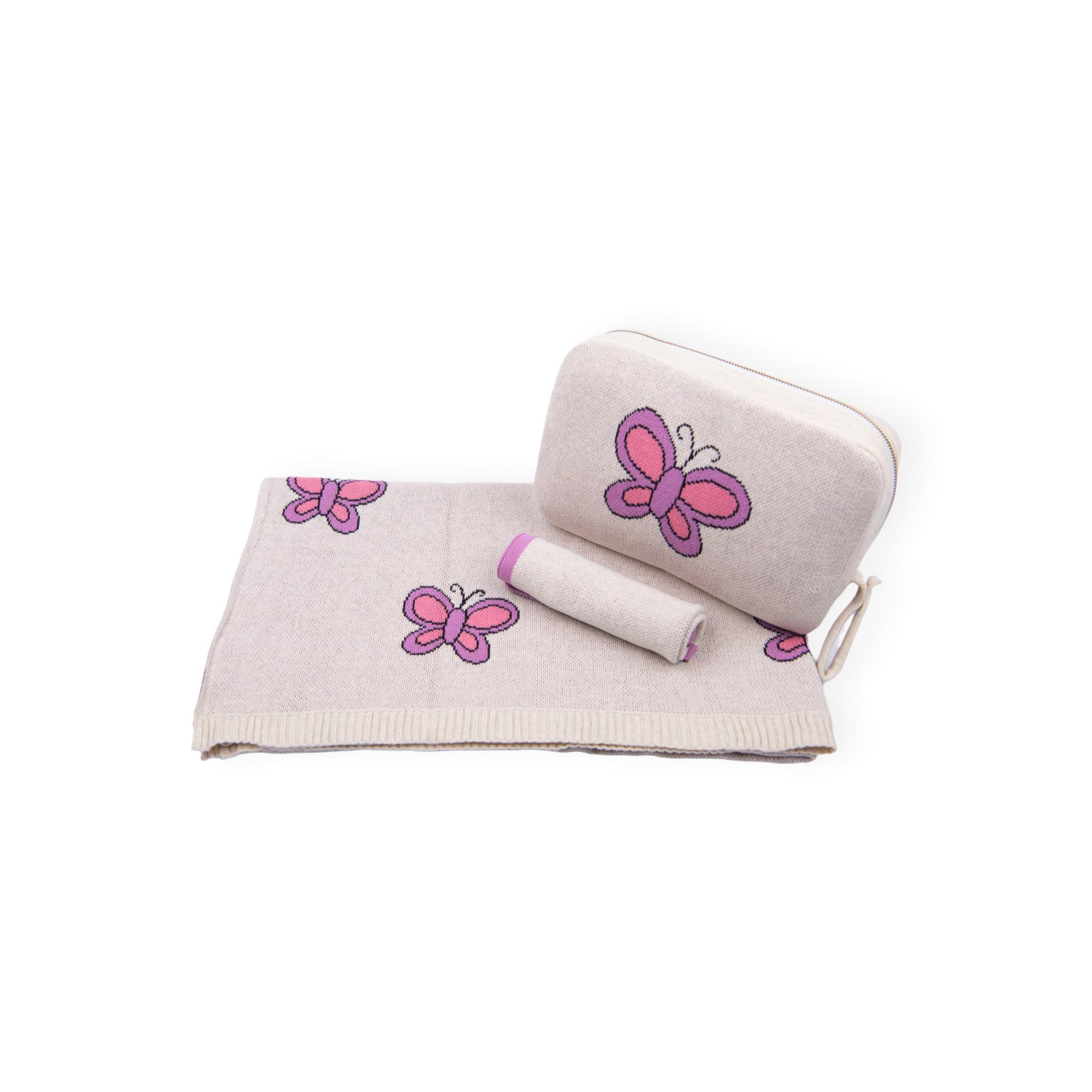 Baby gift Set = Baby Blanket(40 X 48 inches), diaper bag and Burp cloth Wholeslale Price : $48 Retail price : $110 MOQ : 3 Butterfly – Congo/Bubblegum SKU : PLFBBDS42
