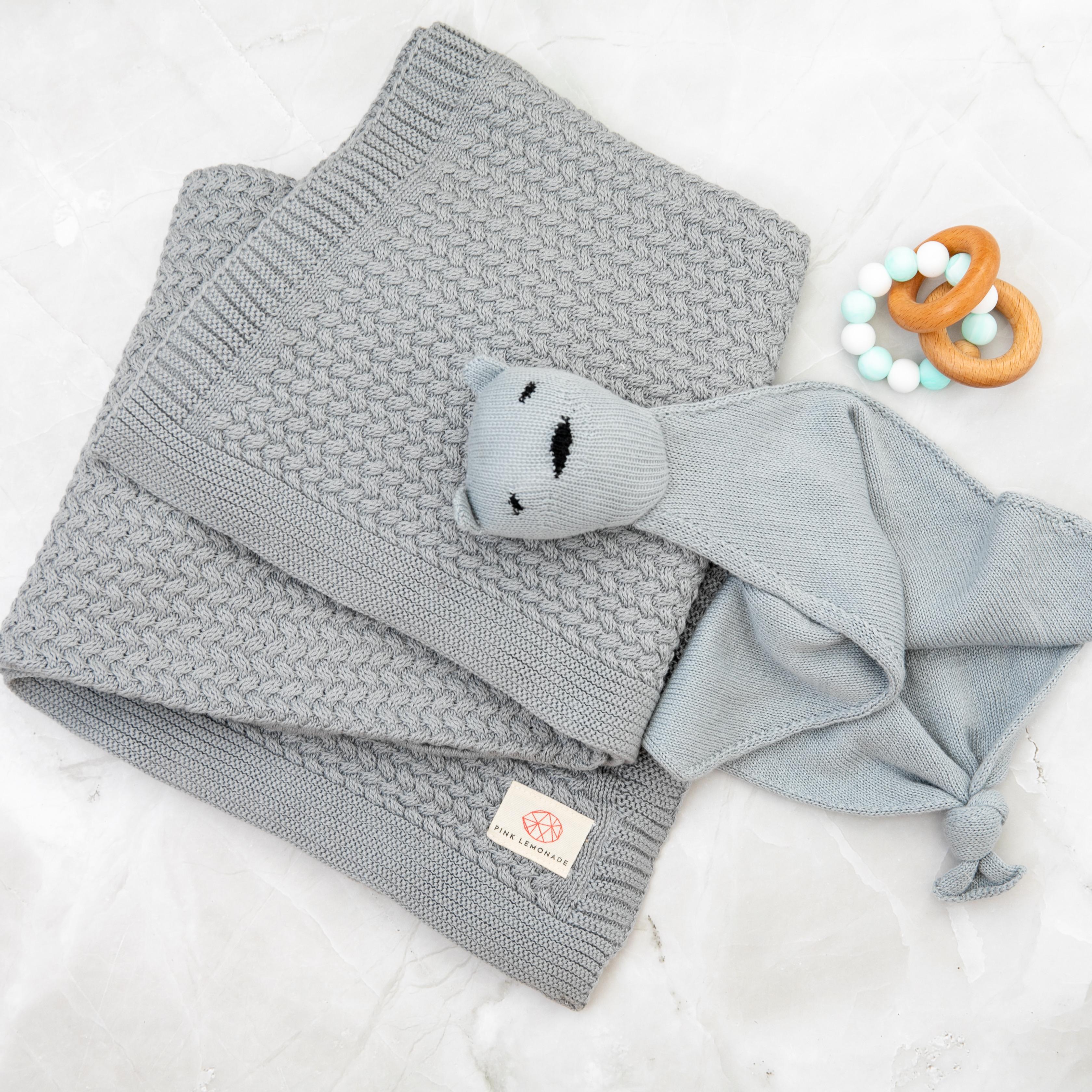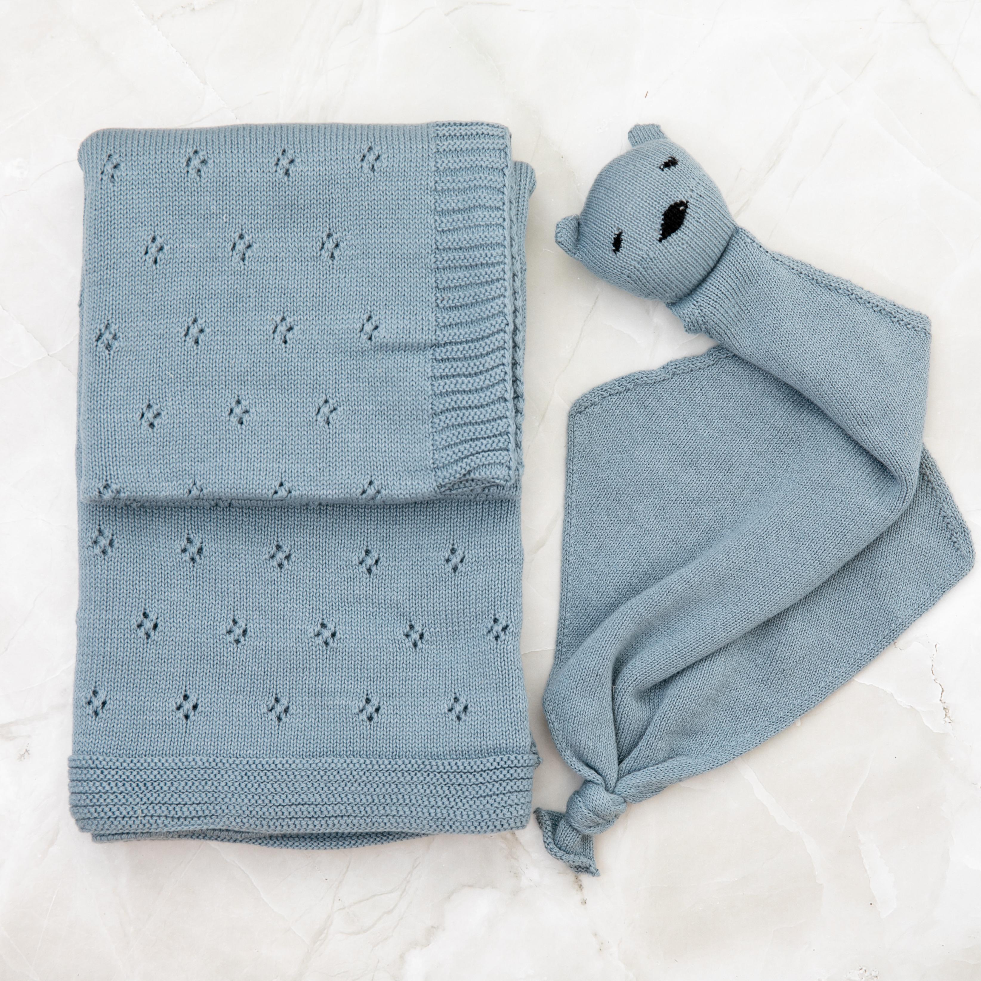 Infant Gift Set Trefle – Blue grey SKU : PLFBIN08 SKU : PLFBTN08 Baby Blanket (32 X 36inches) And Matching same color teddy toy lovie Wholesale Price: $38 Retail : $90 MOQ : 3