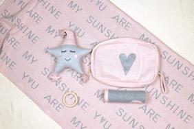 Baby gift Set = Baby Blanket(40 X 48 inches), diaper bag and Burp cloth Wholeslale Price : $48 Retail price : $110 MOQ : 3 Twin hearts – linen/natural SKU : PLFBBDS35