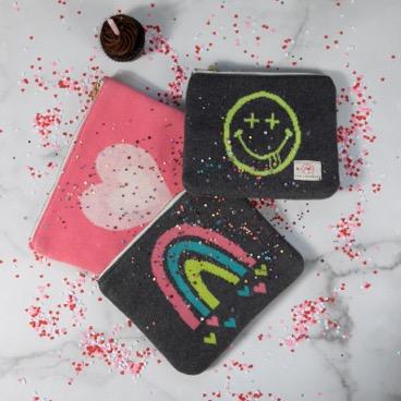 Sku : PLFBMP08 Collection : SMILES AND RAINBOW – DK GREY Wholesale Price: $28 Retail Price: $55 MOQ : 3 SET OF 3 pouches : 10 X 8, 9X 7 and 8X 6 inches respectively. – water proof lining on the inside