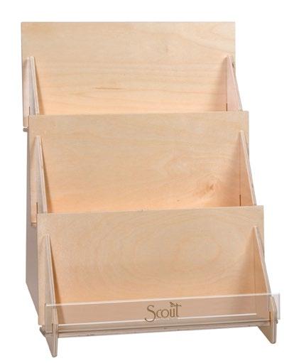 Three shelf step design ships flat and snaps together. Wood with a white wash finish and Scout logo. Hollow back for storing back stock.