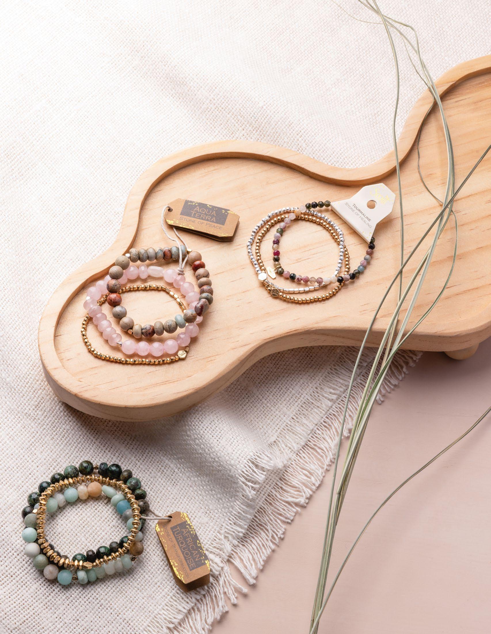 We are excited to introduce our new Mixed Media Stacking Bracelet Collection, sparked by joyful memories. The retro style photographic packaging is sure to capture the attention of your customers. Each piece incorporates a semi-precious stone, making them great gifts.