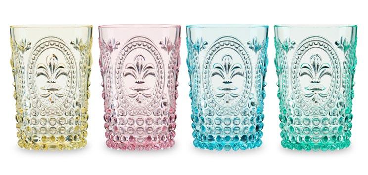 Inspired by traditional clay vessels for sipping mezcal, this colorful glassware is handmade by Mexican artisans from 100% recycled glass. Page 158