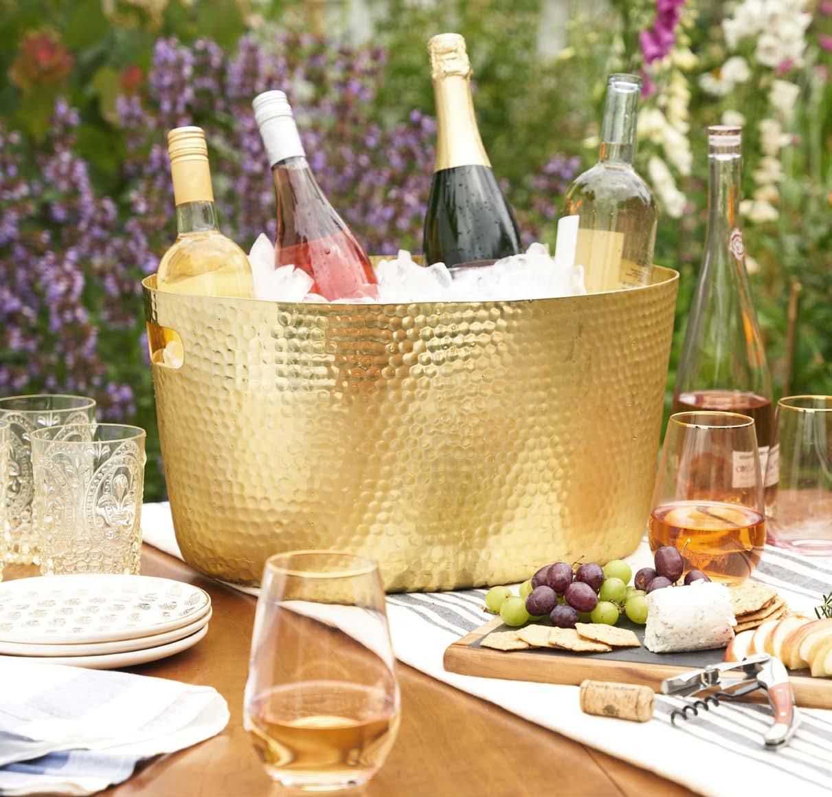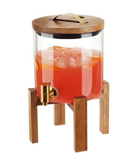 Elevate the barbecue. Perfect for batch cocktails or lemonade, this drink carafe has a bronze spigot and wooden stand.