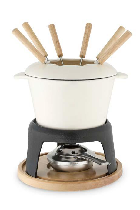 Set includes enamel coated cast iron pot & stand, chrome burner, 6 rubberwood & stainless steel forks, & rubber wood base plate Compatible with gas and electric cooktops • DIM: 8" D PKG: Box