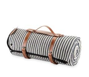 Includes genuine leather carrier & 4 picnic stakes Waterproof lining • Nautical pinstripe details • PKG: Tag