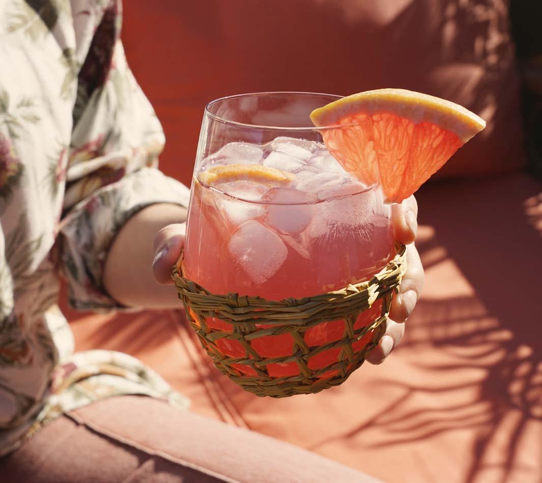 Removable seagrass wraps add an easygoing coastal touch to this glassware set.