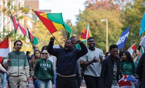 PHOTO 2: A member of Ohio University Culinary Services throws candy during the Homecoming parade , Oct. 18, 2025 (TALITHA MALOY | PHOTO EDITOR) People wave international flags during the Homecoming parade, Oct. 18, 2025. (ELLE MALTRY | FOR THE POST)