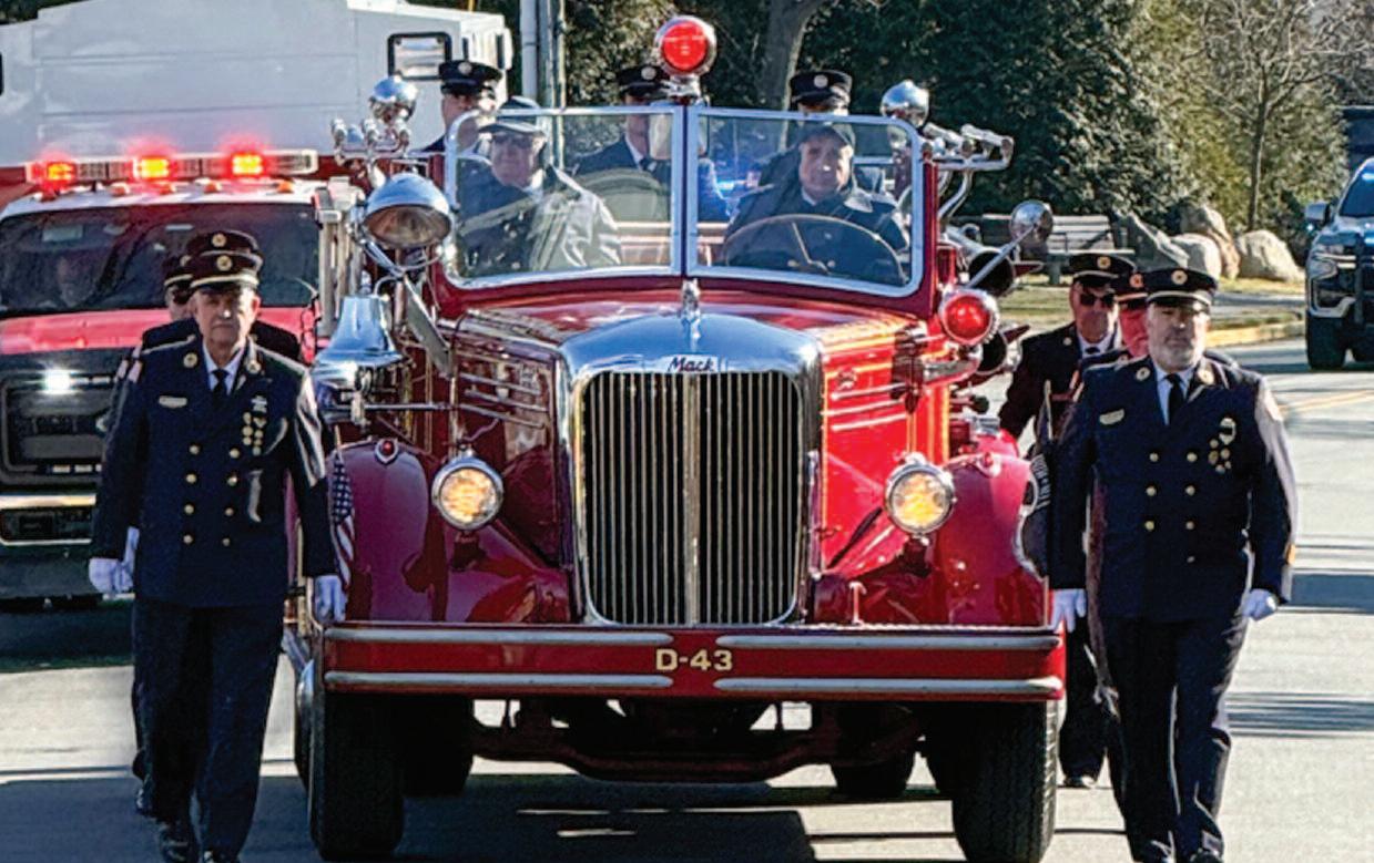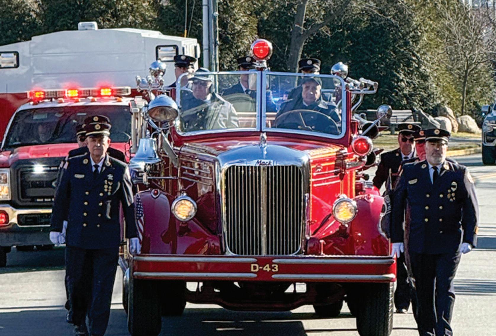 In a tribute drawing from the departments where he served, firefighters turned out to render honors for ex-chief John J. Rinaldi. Page 5