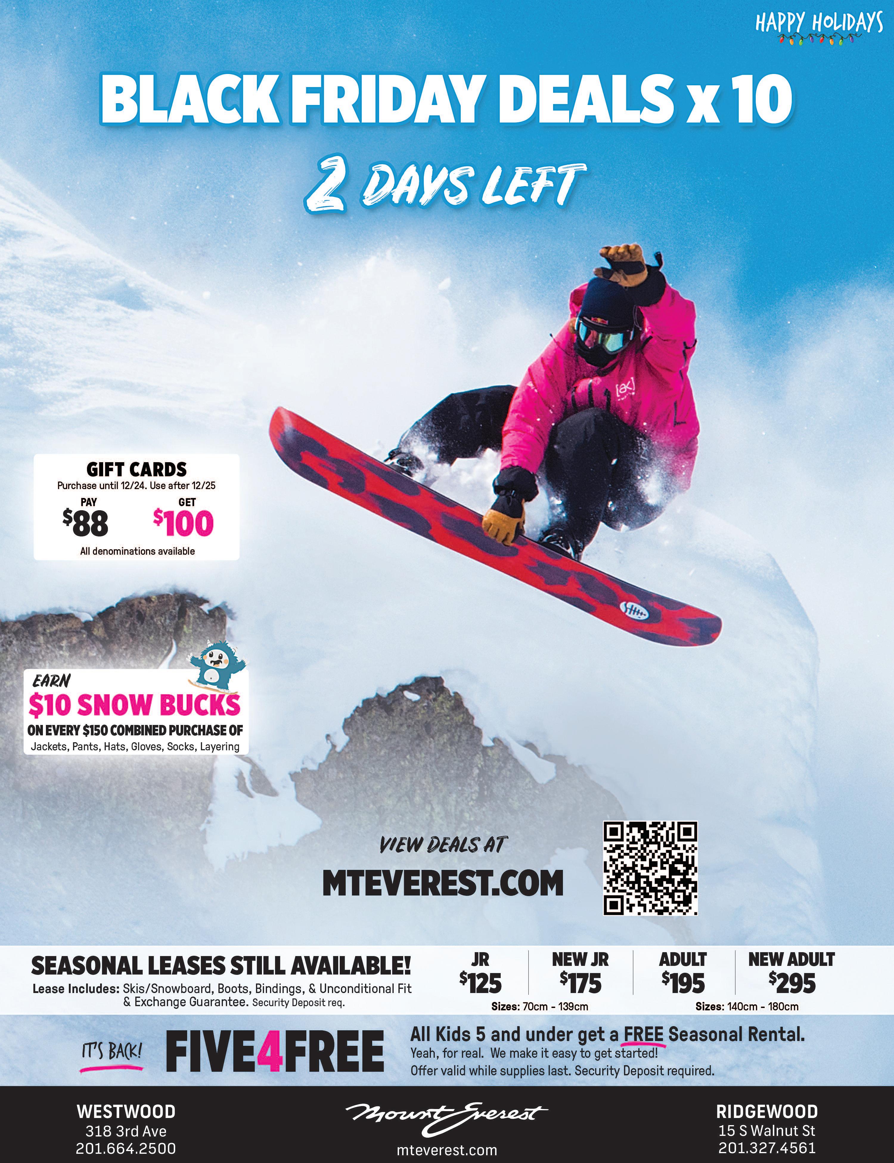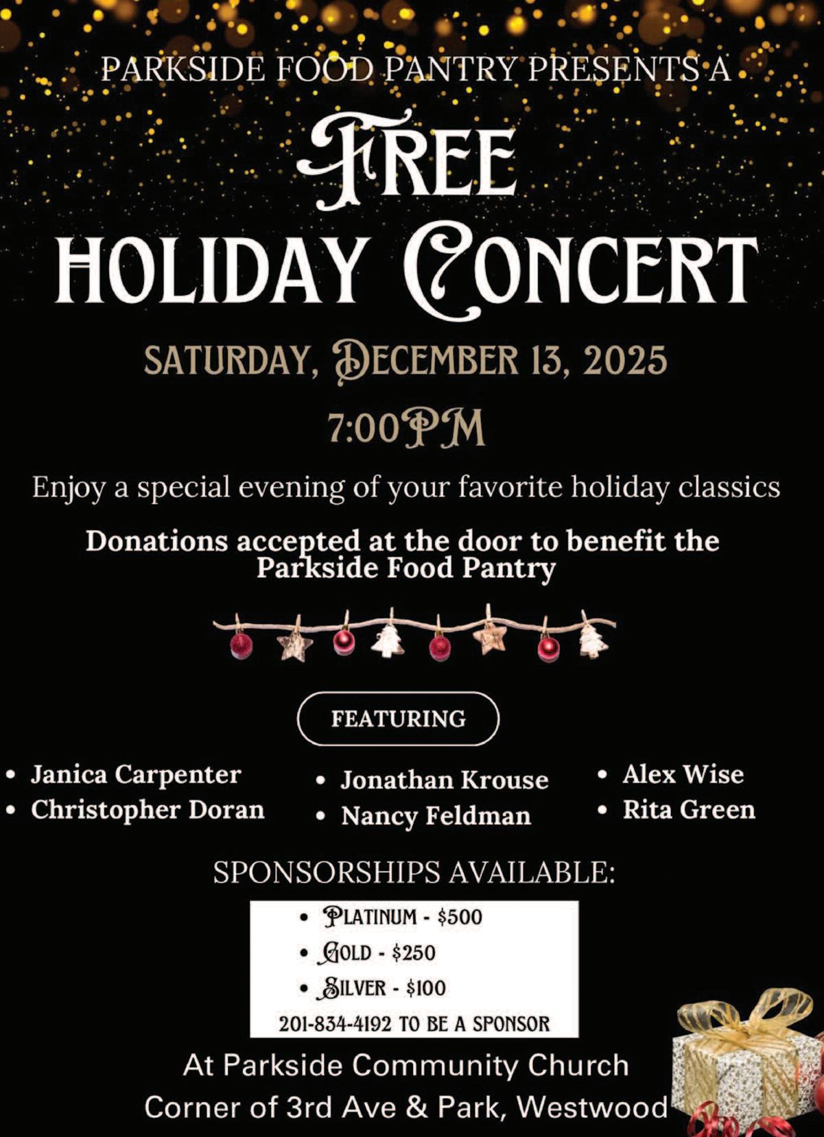 Elks and the Womanʼs Club. Attendees are encouraged to bring nonperishable food for the Tri-Boro Food Pantry, along with unneeded cell phones, eyeglasses, and gently used shoes or sneakers for repurposing or recycling. Reservations are required and must be received by Dec. 5. To reserve, send a check payable to Greater Pascack Valley Womanʼs Club—along with your contact information, number of children attending, and their ages—to Greater Pascack Valley Womanʼs Club, P.O. Box 3, Park Ridge, NJ 07656. For more information, call (201) 746-5783 or email gpvwc1990@gmail.com.