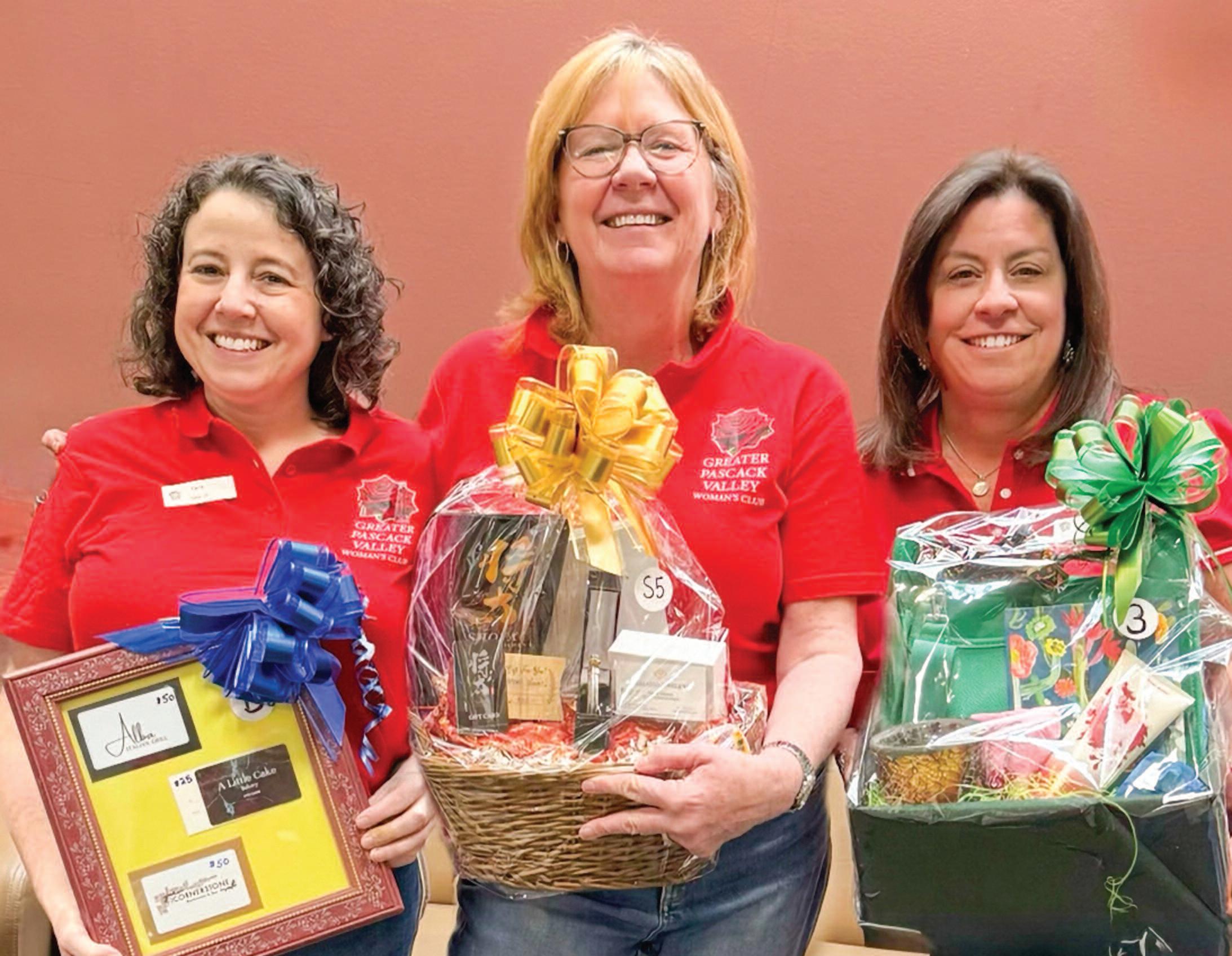 Three of the many prize baskets donated to the Greater Pascack Valley Woman’s Club’s recent Military Bridge fundraiser as displayed by event chairwomen Carla Cherrey, Bridget Bruno and Jennifer Snyder.