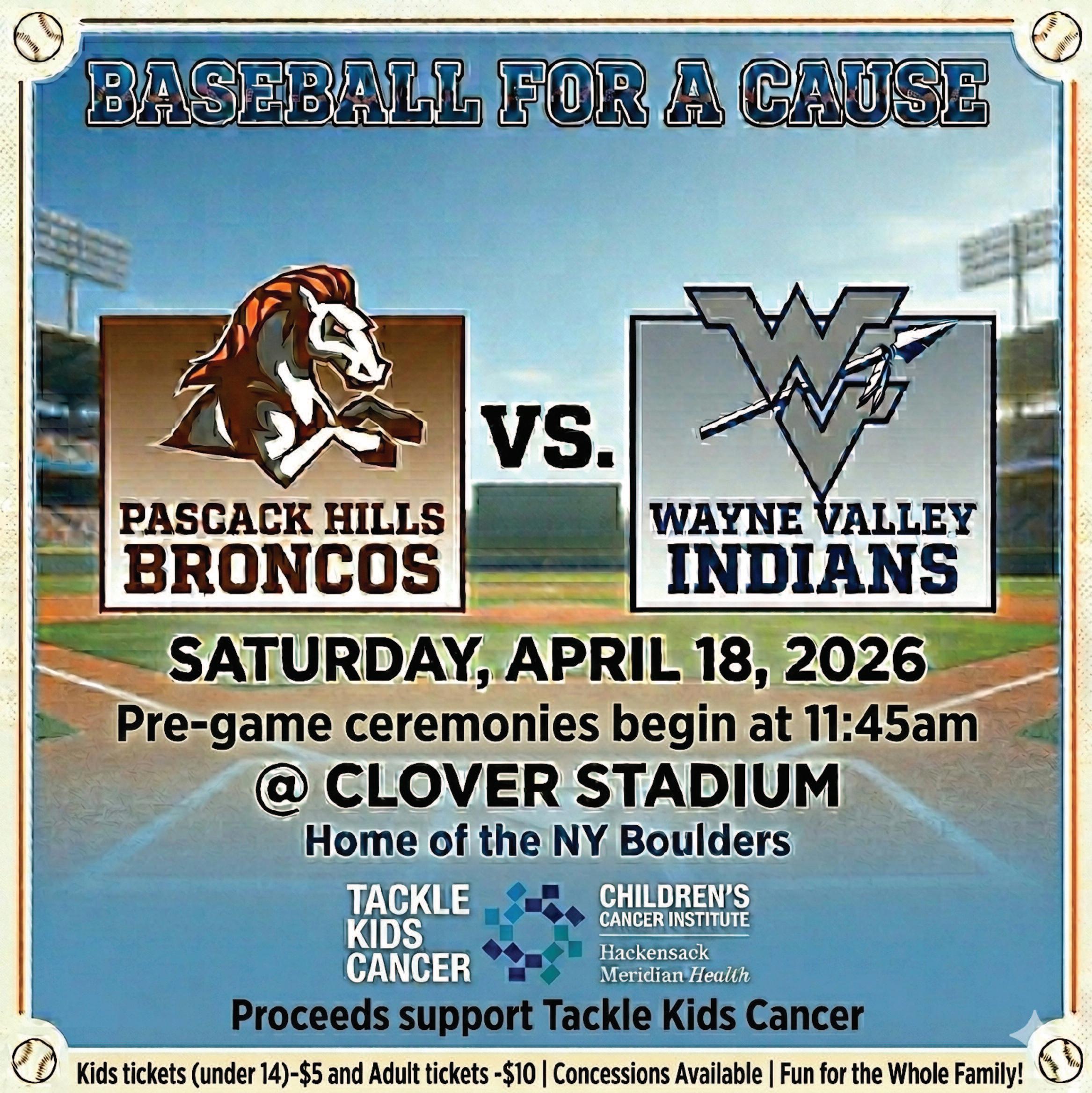 MONTVALE — Pascack Hills High Schoolʼs varsity baseball team takes on Wayne Valley High School in a benefit game Saturday, April 18, at Clover Stadium, home of the Rockland Boulders, with proceeds supporting Tackle Kids Cancer.