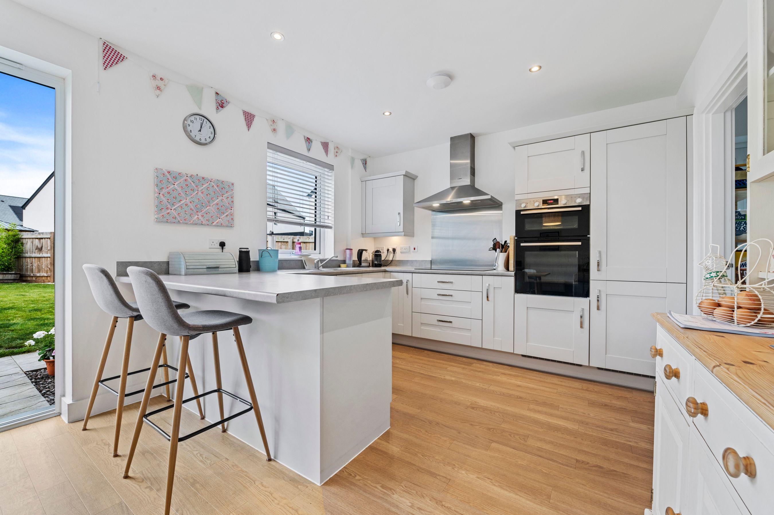 The kitchen is equipped with sleek, integrated appliances, which include a fridge freezer, ceramic hob, dishwasher and double oven, offering ample space for both cooking and dining, opening out through bi-folding doors, onto a larger than average, well-maintained garden – ideal for summer barbecues, children's play, or simply unwinding.