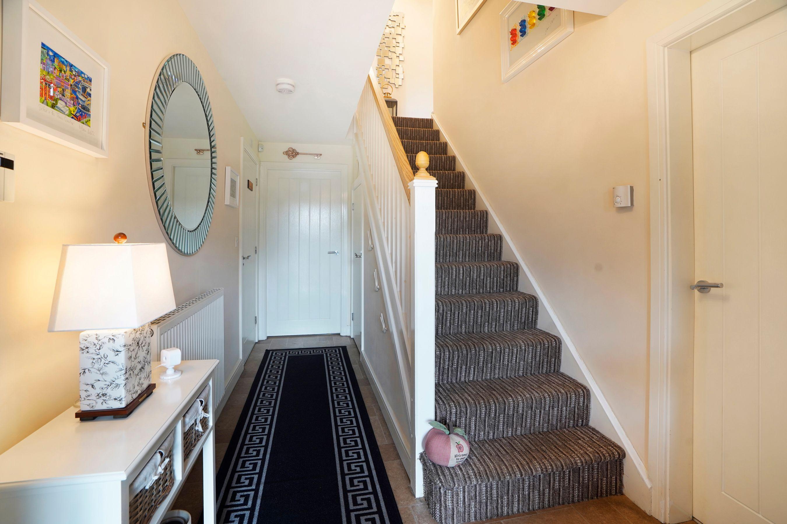 Upon approaching the property you’re met with an attractive landscaped front garden which is filled with a selection of mature shrubs and bushes. The front entrance is protected from the elements by a large porch which is supported by an exterior wooden porch column.
