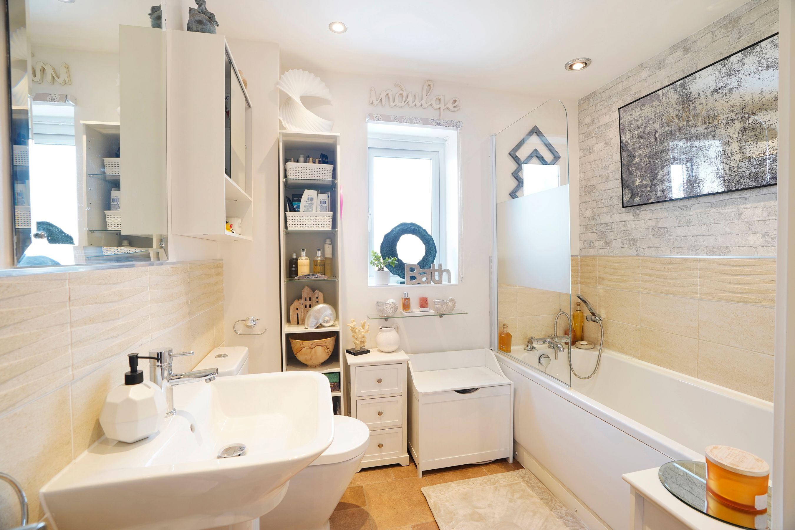 The main bathroom offers a feeling of great luxury thanks to the integrated shower bath, with a built-in shower screen, a wash basin, WC, a storage cabinet and a frosted glass window. All of which make the main bathroom a truly relaxing space to help you ease into the day ahead.