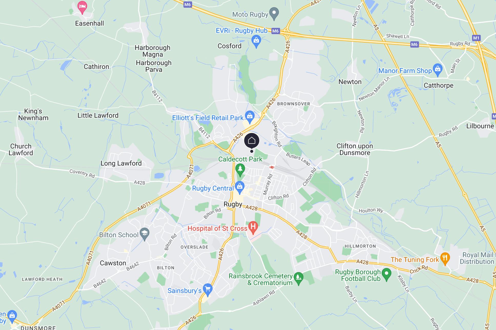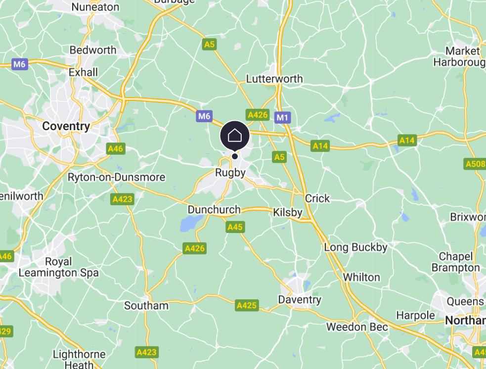 Heading East on M6, take the junction 1, A426 exit. At the roundabout, take the 2nd exit. At the roundabout, take the 2nd exit. At the roundabout, take the 2nd exit. At Kipling Roundabout, take the 2nd exit. At the roundabout, take the 2nd exit. Turn left onto Technology Drive. At the roundabout take the 2nd exit. Turn right onto Baker Street. Turn left onto Wynne Crescent. 24 Wynne Crescent, Rugby, CV21 1NS will be on the right.