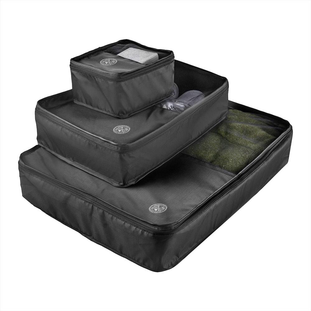 The Packing Cubes 3 Piece Set includes three different sized packing cubes, which are constructed from durable polyester. Each cube has an additional sleeve that allows the piece to be neatly compressed and folded into the pouch.