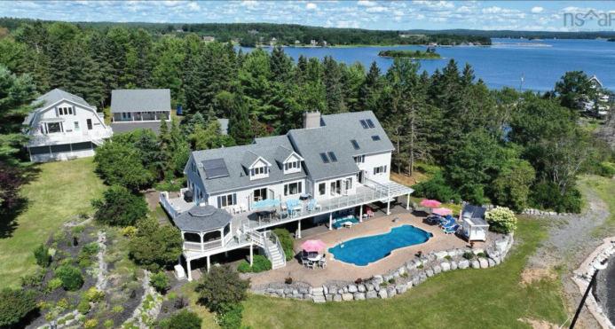 THE BEST SAILING WATERS ON THE EASTERN SEABOARD AND ENJOY COOL SUMMER BREEZES ON NOVA SCOTIA’S SOUTH SHORE. “Scallop Bay” is a home for all seasons. Almost 6 acres of park-like peace and quiet, +1100 feet of direct oceanfront with outstanding ocean views, wharf with three floating docks and 2 moorings, and a welcoming 5 bedroom, 5 1/2 bath Coastal Post and Beam home. There is an in ground salt water generated pool, hot tub, extensive outdoor IPE decking for entertaining and large screened gazebo, detached triple garage, self contained fully serviced 2 bedroom guest quarters, 26 x 36 multi use building and so much more... $3,975,000.