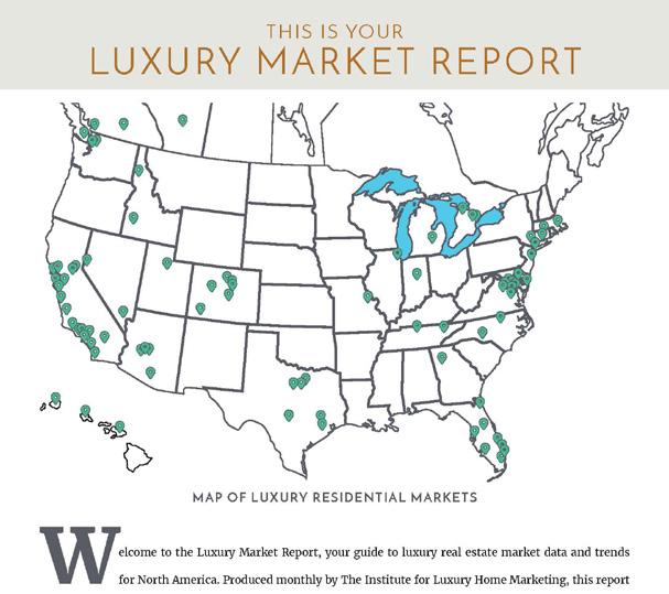 The Luxury Market Report is your guide to luxury real estate market data and trends for North America. Produced monthly by The Institute for Luxury Home Marketing, this report provides an indepth look at the top residential markets across the United States and Canada. Within the individual markets, you will find established luxury benchmark prices and detailed survey of luxury active and sold properties designed to showcase current market status and recent trends. The national report illustrates a compilation of the top North American markets to review overall standards and trends.