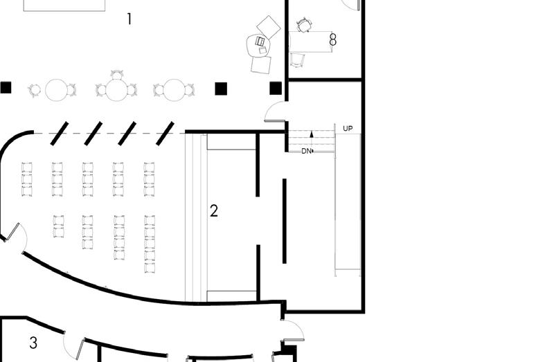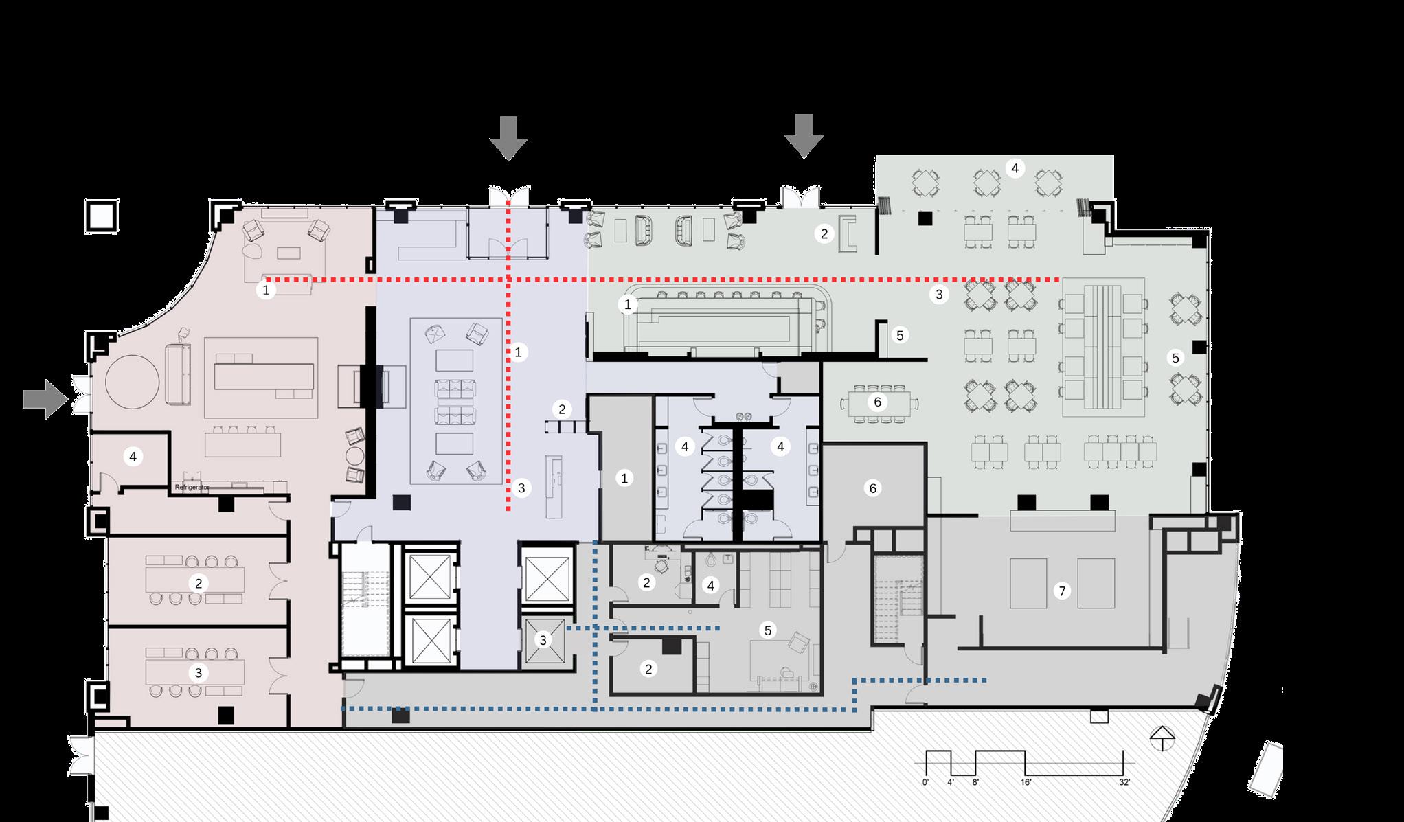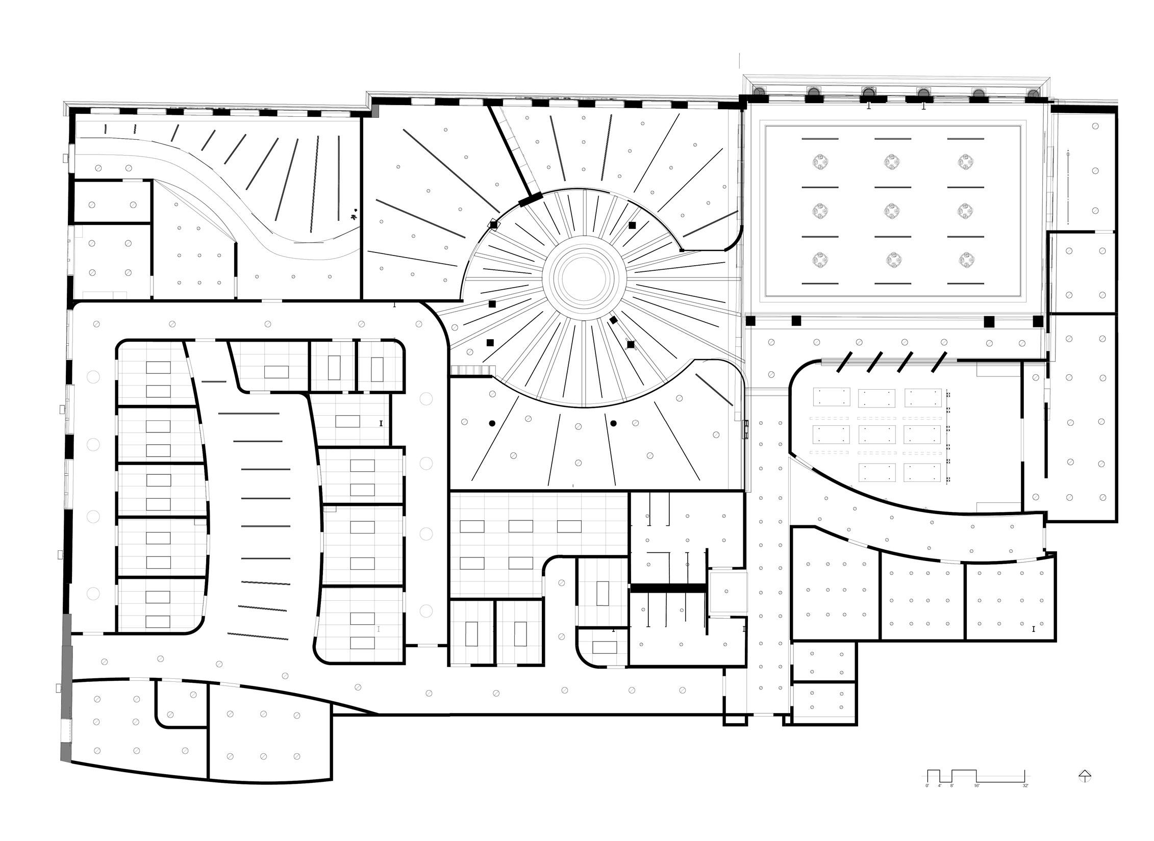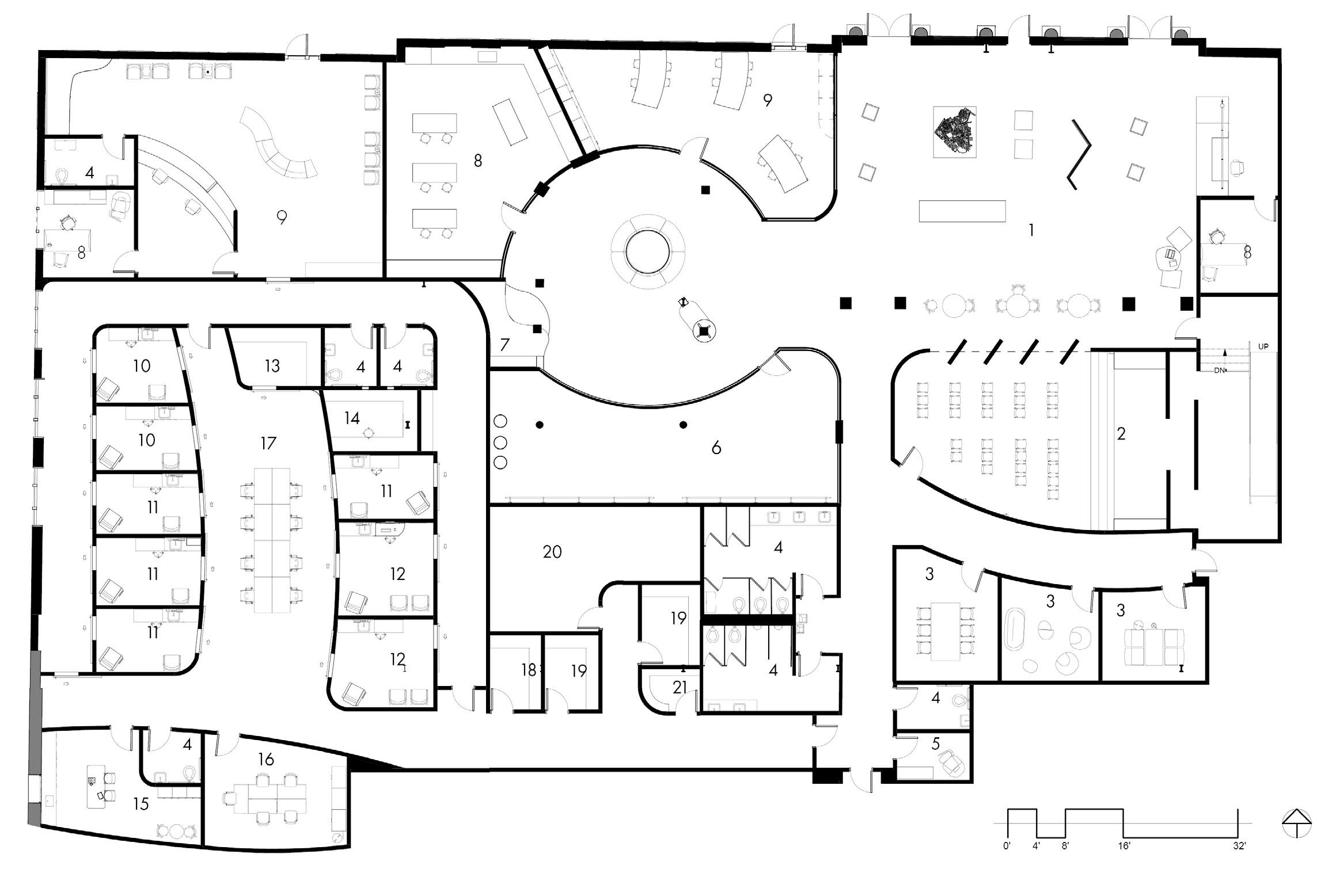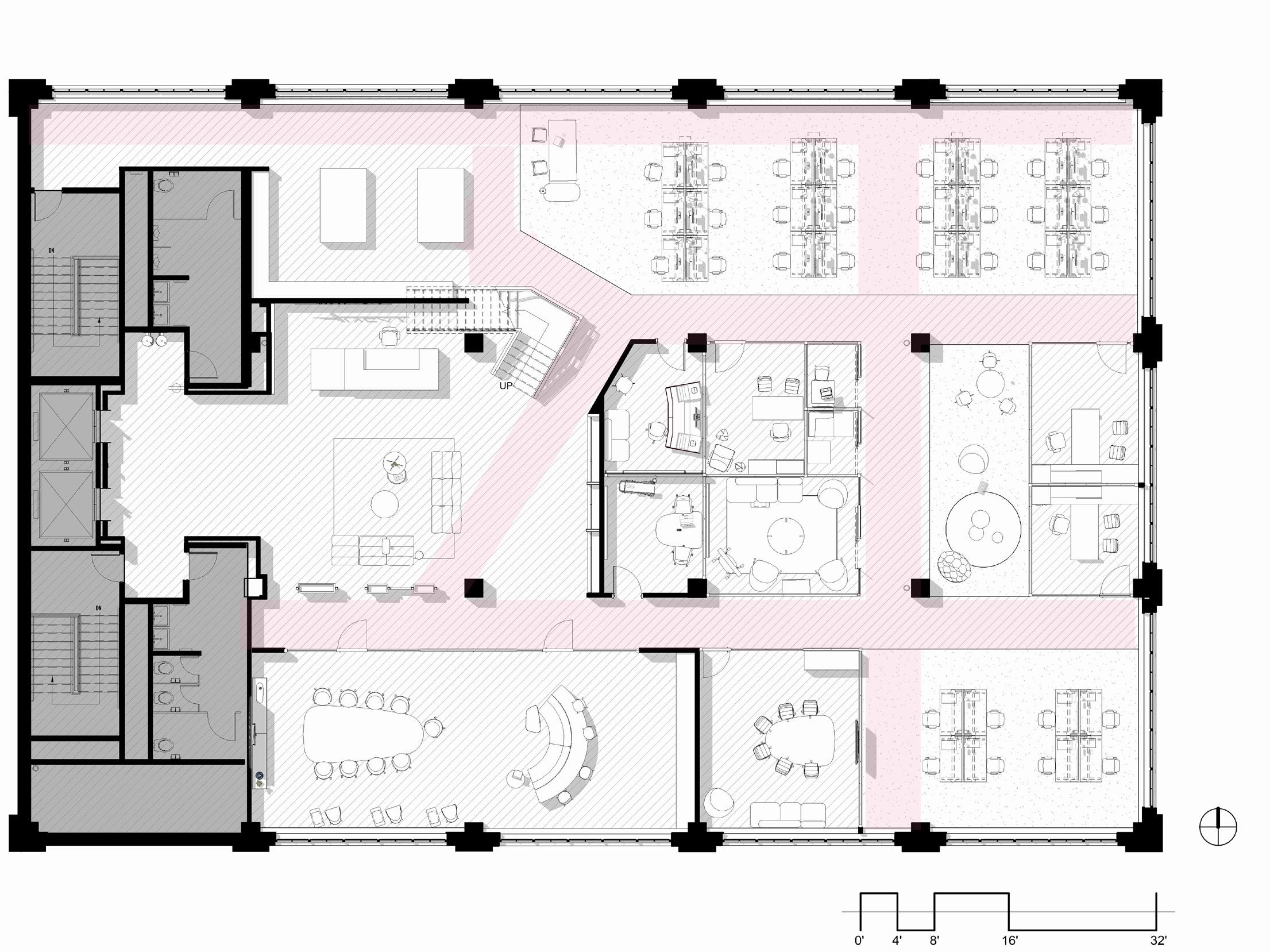 The design utilizes the rectilinear shape of the building as an organizing framework to structure and aligns space that is easily readable.