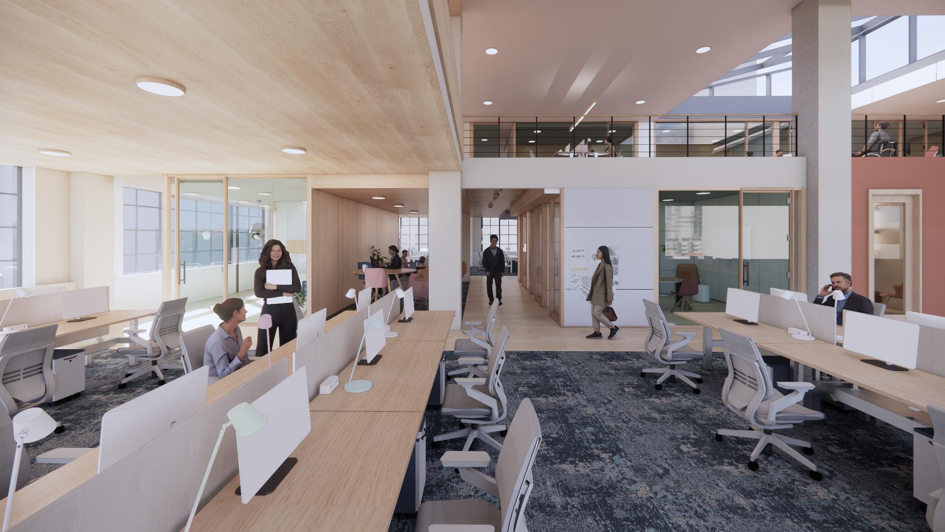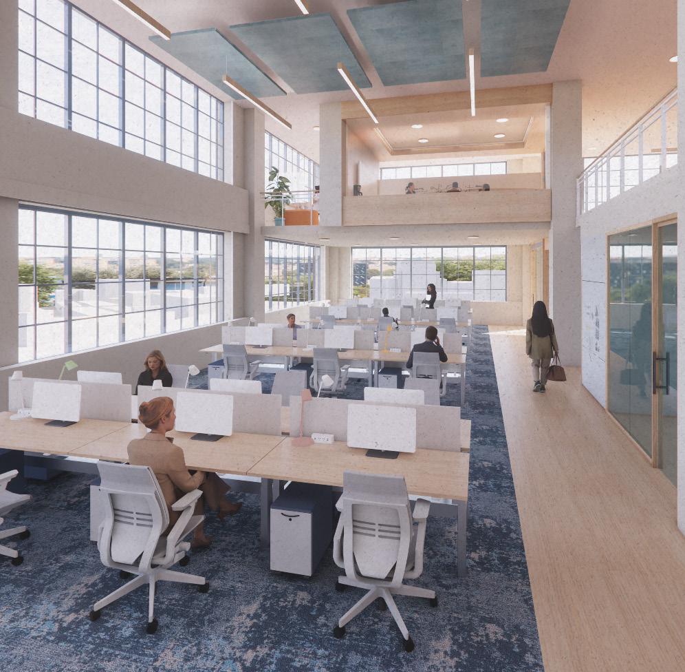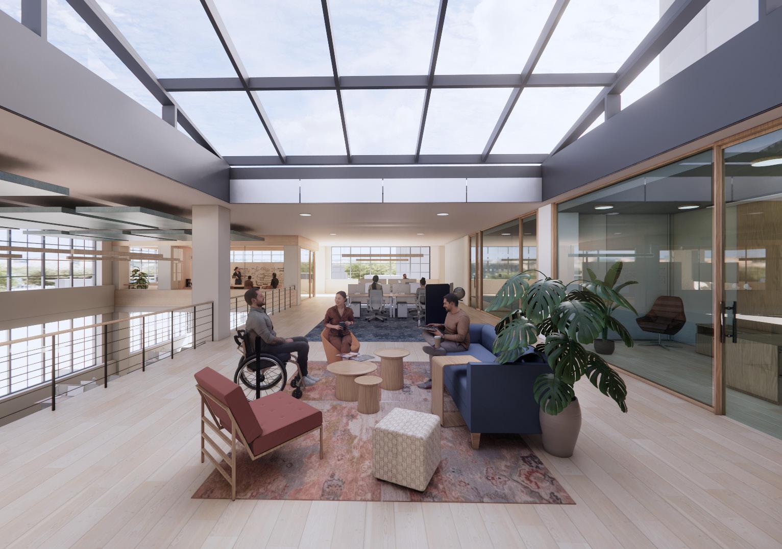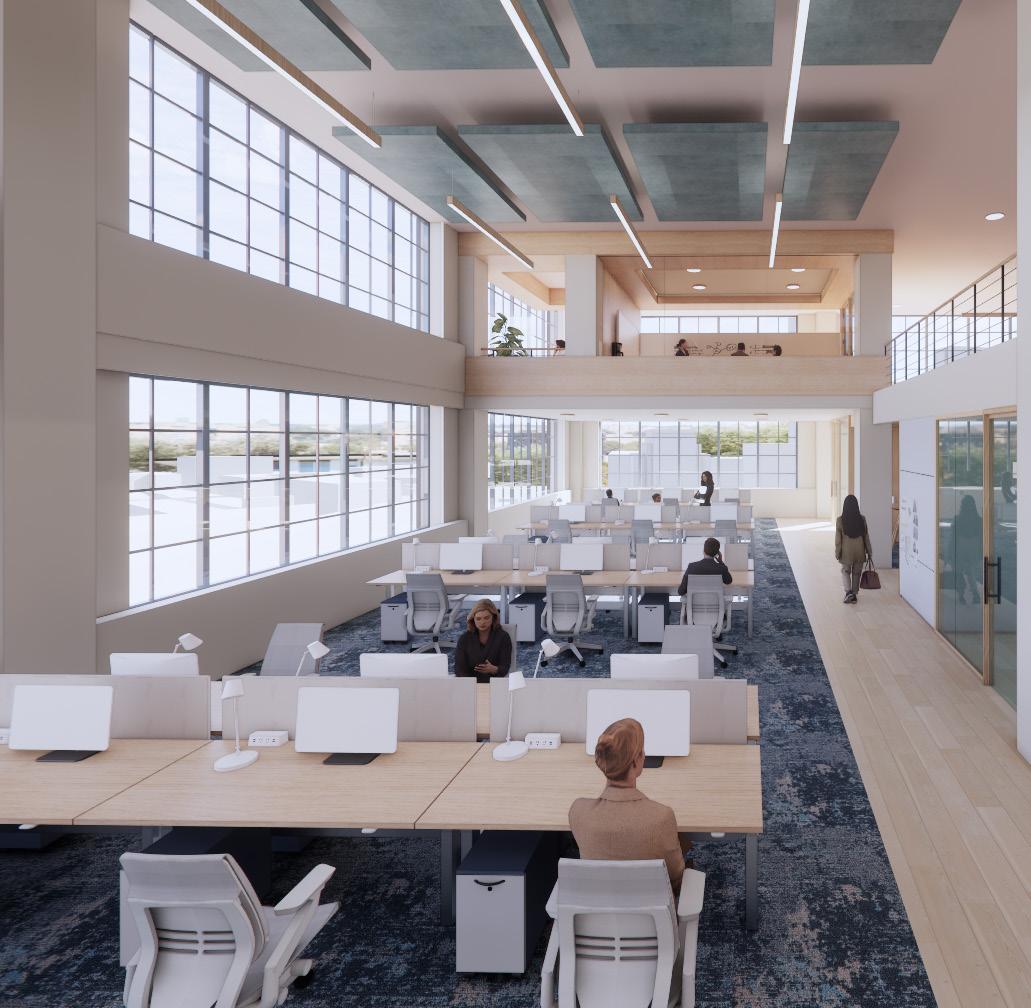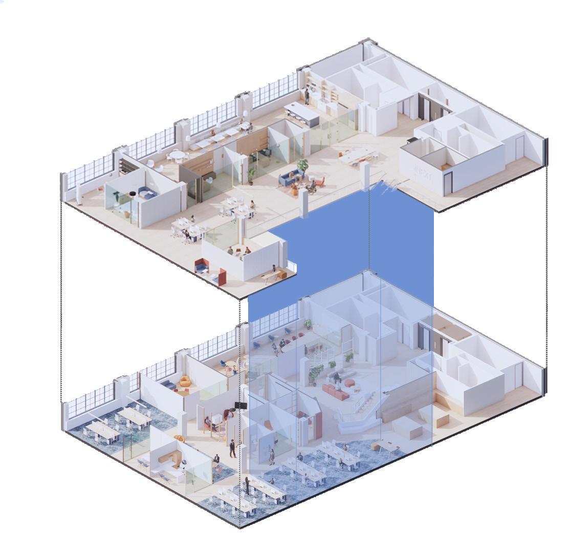 The double-height space visually and physically connects both levels and their work teams, while bringing more natural light to both flloors.