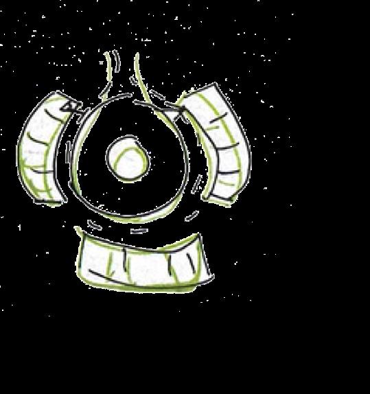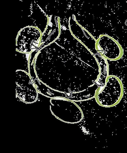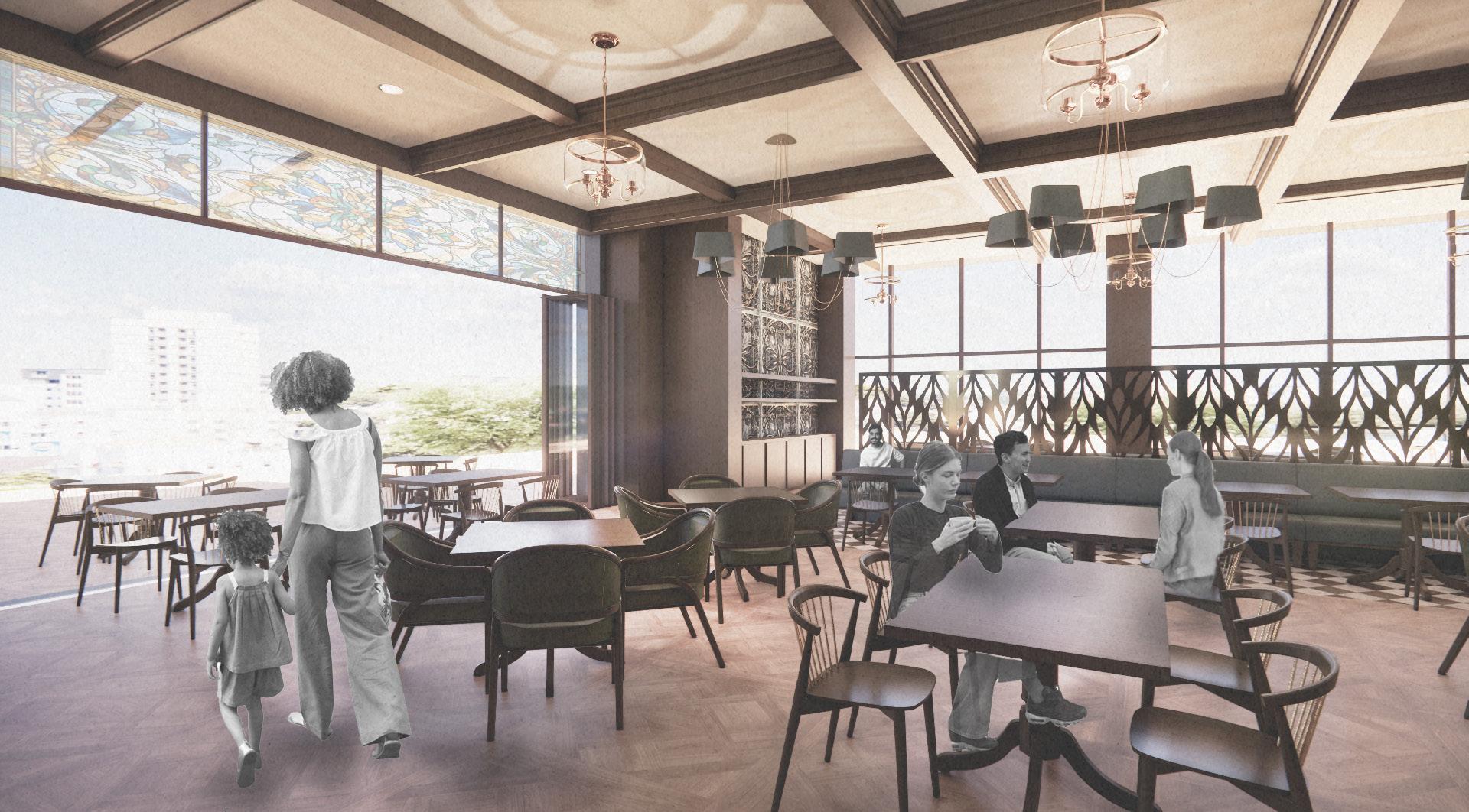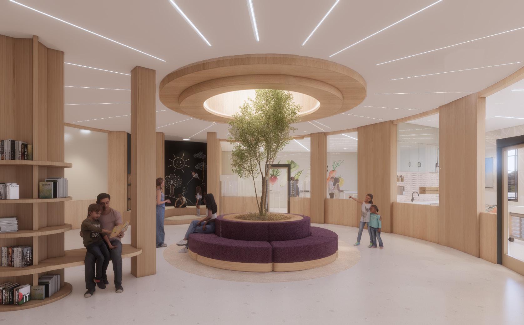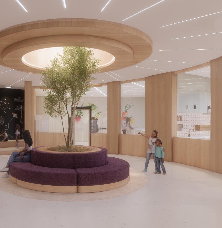 The radial ceiling, with a central skylight, represents sunbeams shining down, while the life below - people and greenery reflects growth and vitality of the neighborhood