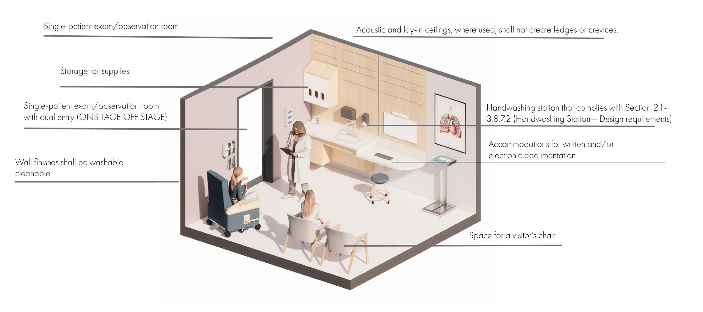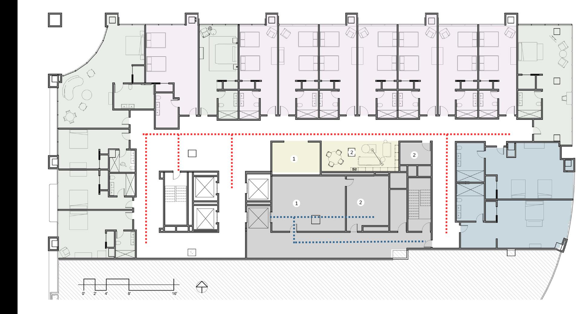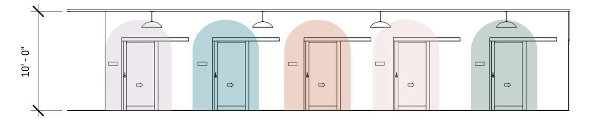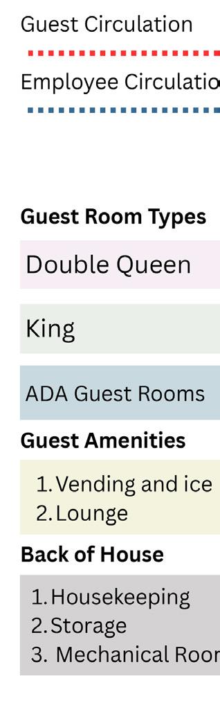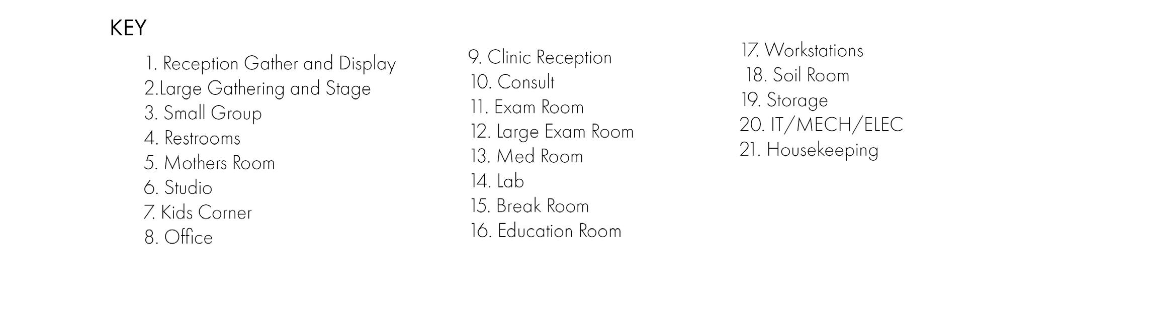 The clinic is organized using an onstage/off-stage planning strategy, which clearly separates patient-facing areas - such as reception, waiting, and exam rooms - from staff and support spaces. This approach allows patients to move through a calm, intuitive, and welcoming environment, while backof-house functions remain discreetly out of view. By minimizing visual and physical overlap between public and operational zones, the layout is meant to enhance privacy, reduce stress, and create an easier experience for visitors.
