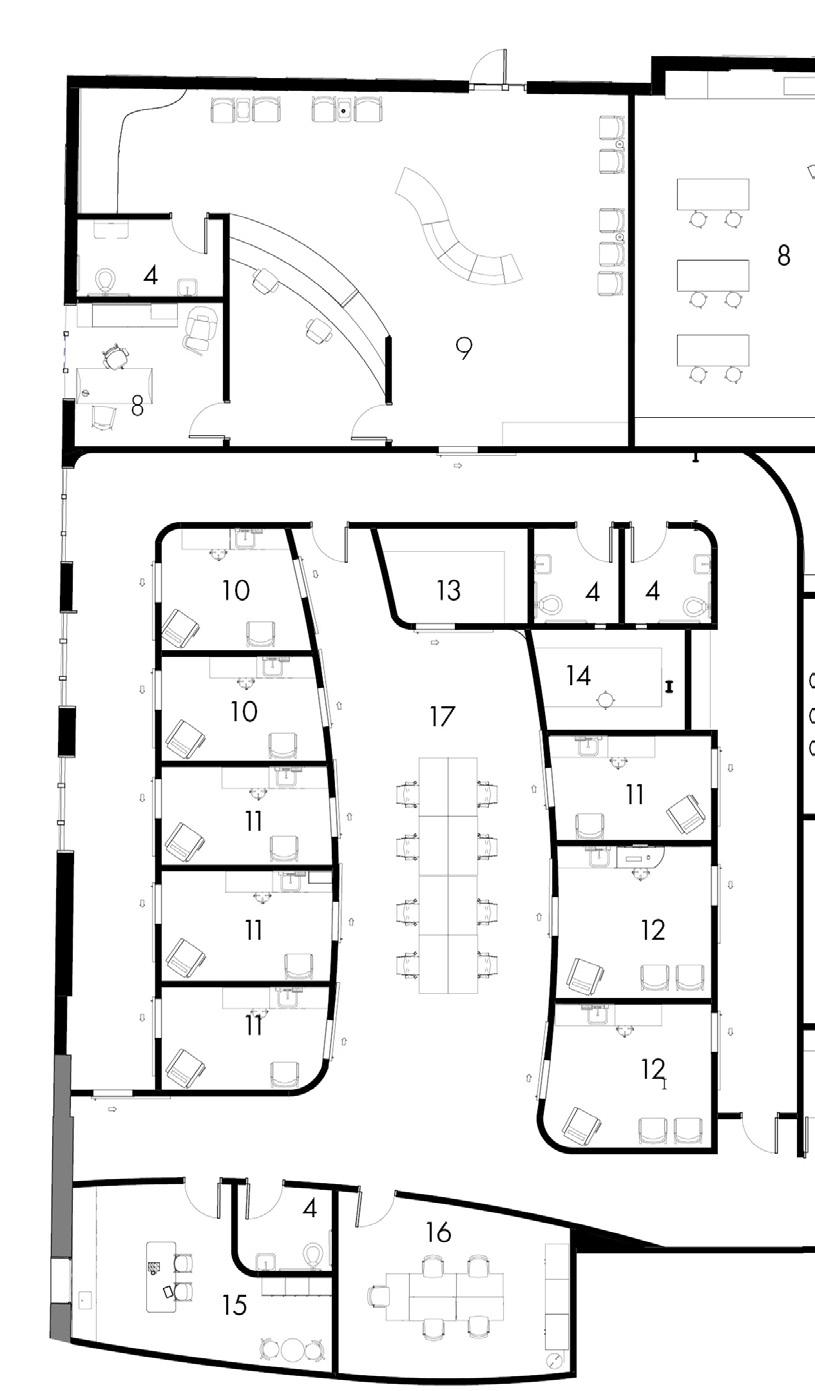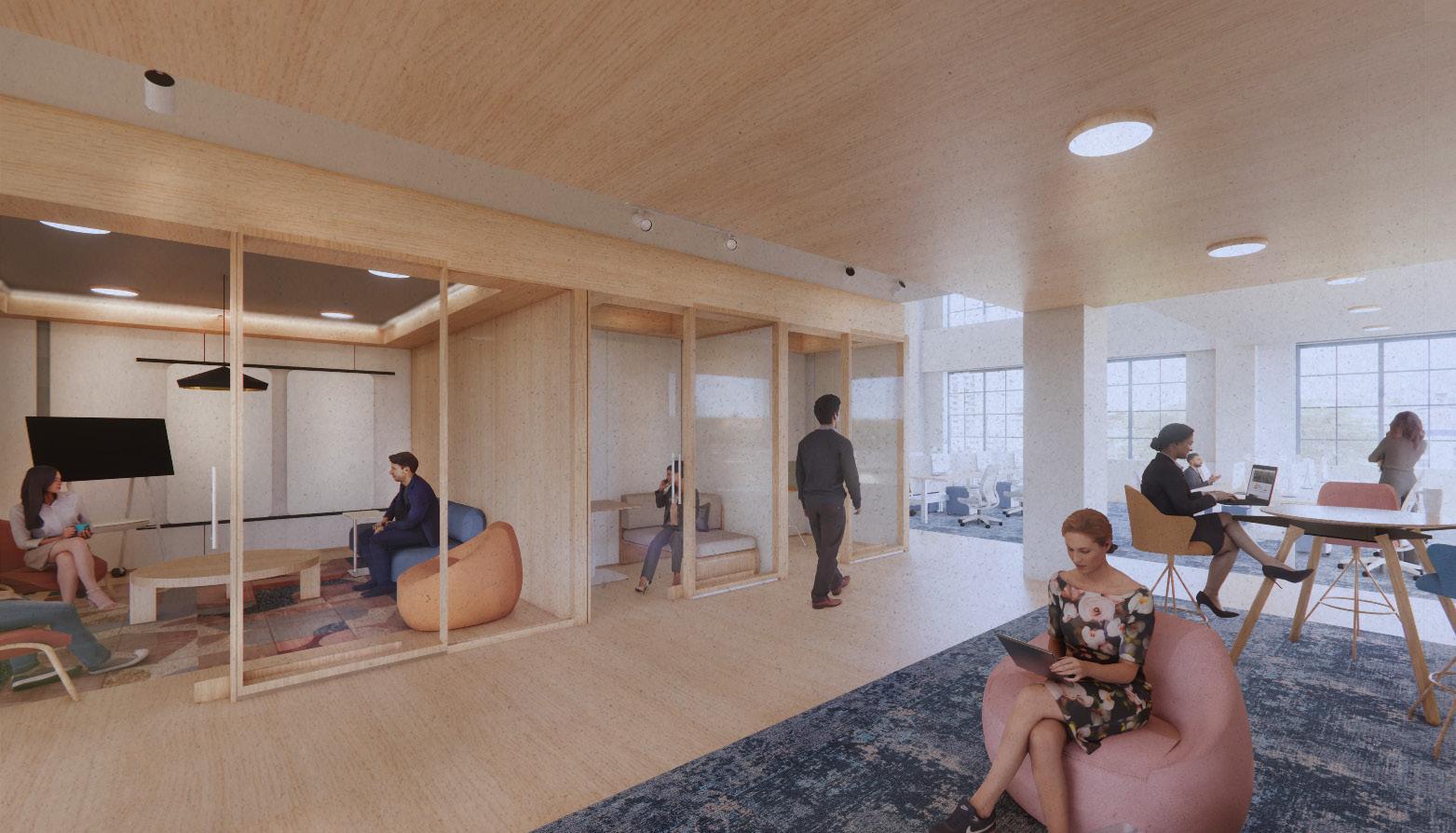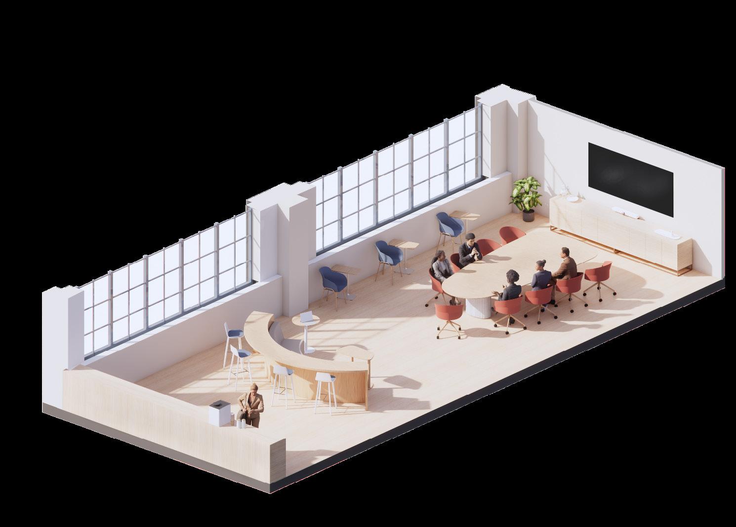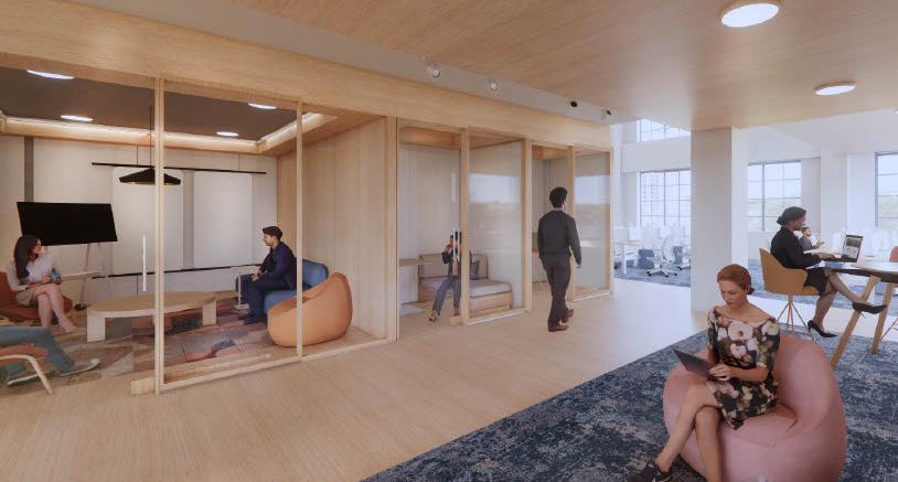 - Lounge spaces with modular screens for informal collaboration and brainstorming.