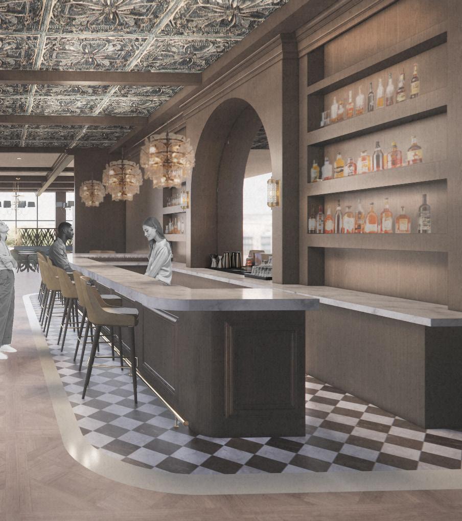 The bar is located directly off the lobby and connects to the restaurant. The bar features white marble counter tops, a custom and a built-in foot rail. Other details include a ceiling with English tile motifs and exposed wood beams to bring alive the