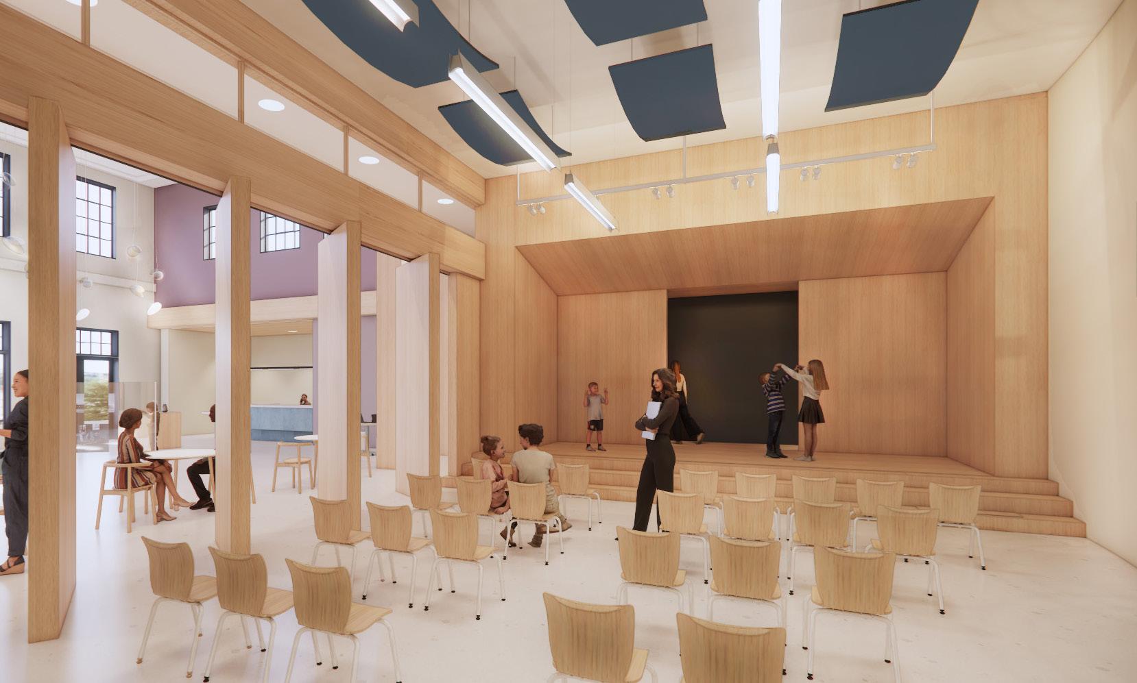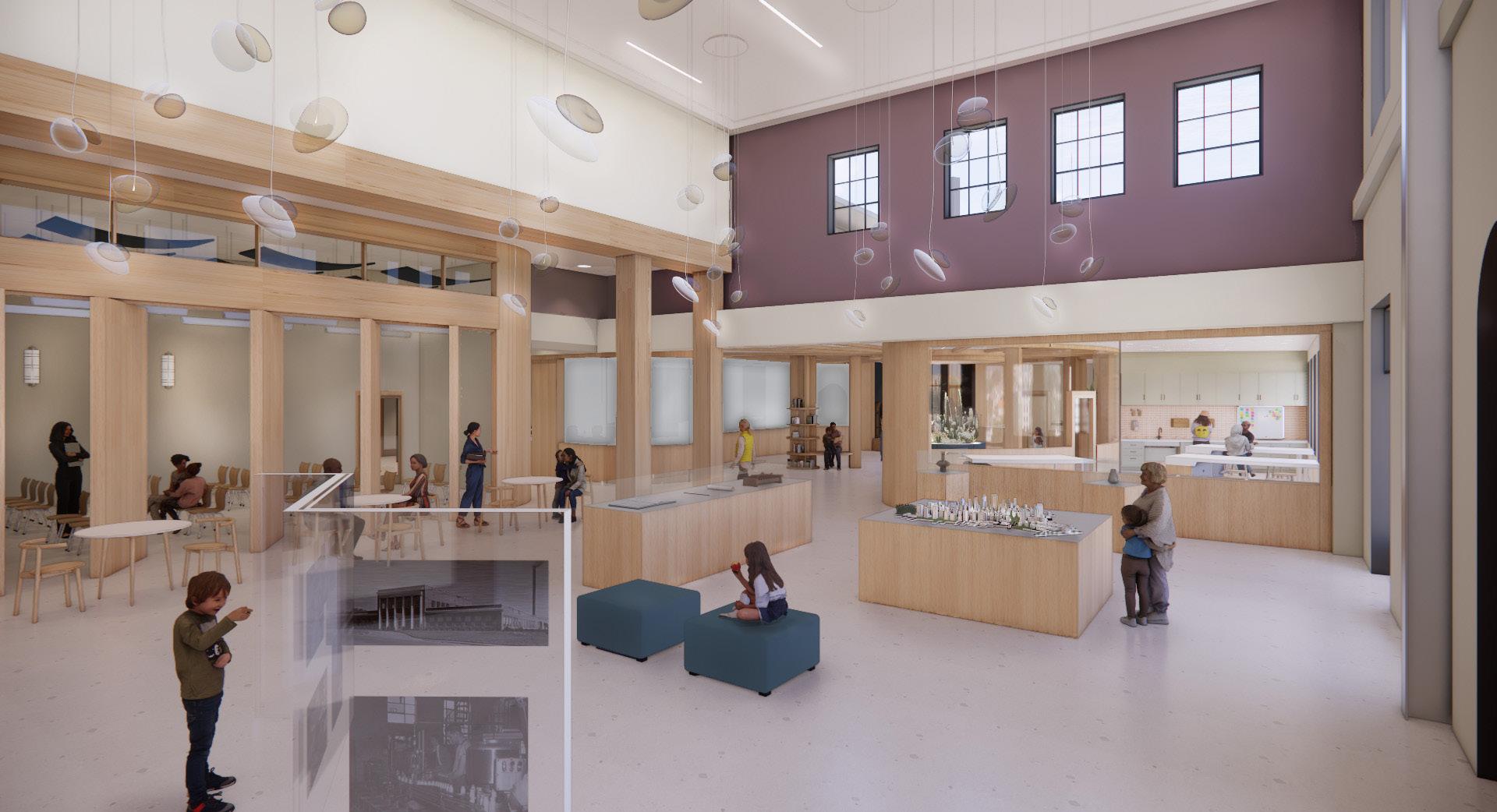 This central activity space serves as the heart of the facility, featuring a learning lab, community kitchen, and a versatile studio for exercise, dance, and other programs.