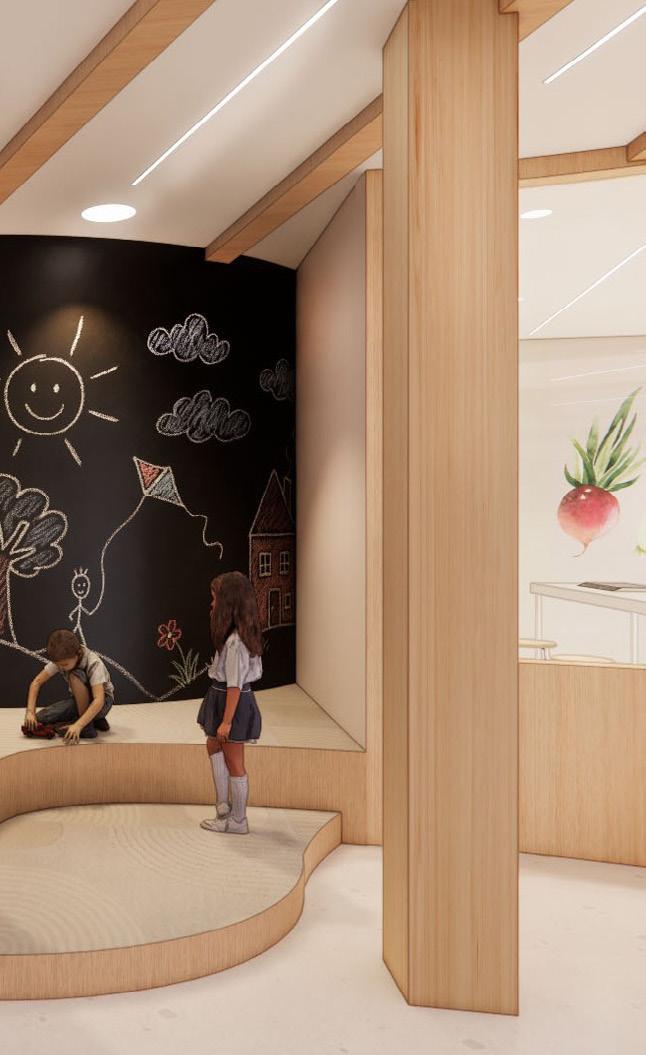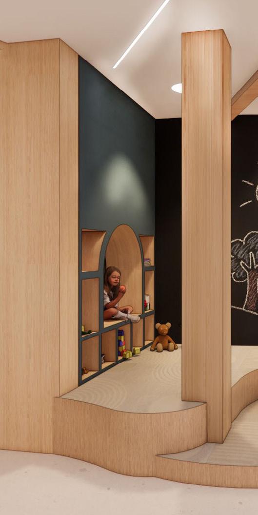 Structural elements turned into opportunities for intimate seating, encouraging quiet reading, exploration, and a sense of retreat within the larger, active environment Reading Spot