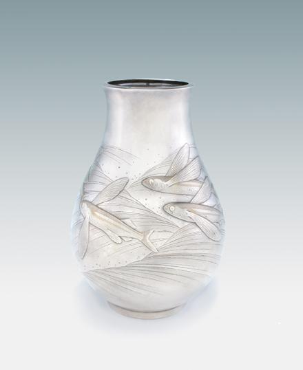 Isozaki Yoshitsugu (Bia) (Japanese, 1884–1949), Vase with Flying Fish Design, ca. 1930s. Silver with gilding, 12 x 8 2/5 in. Private Collection.